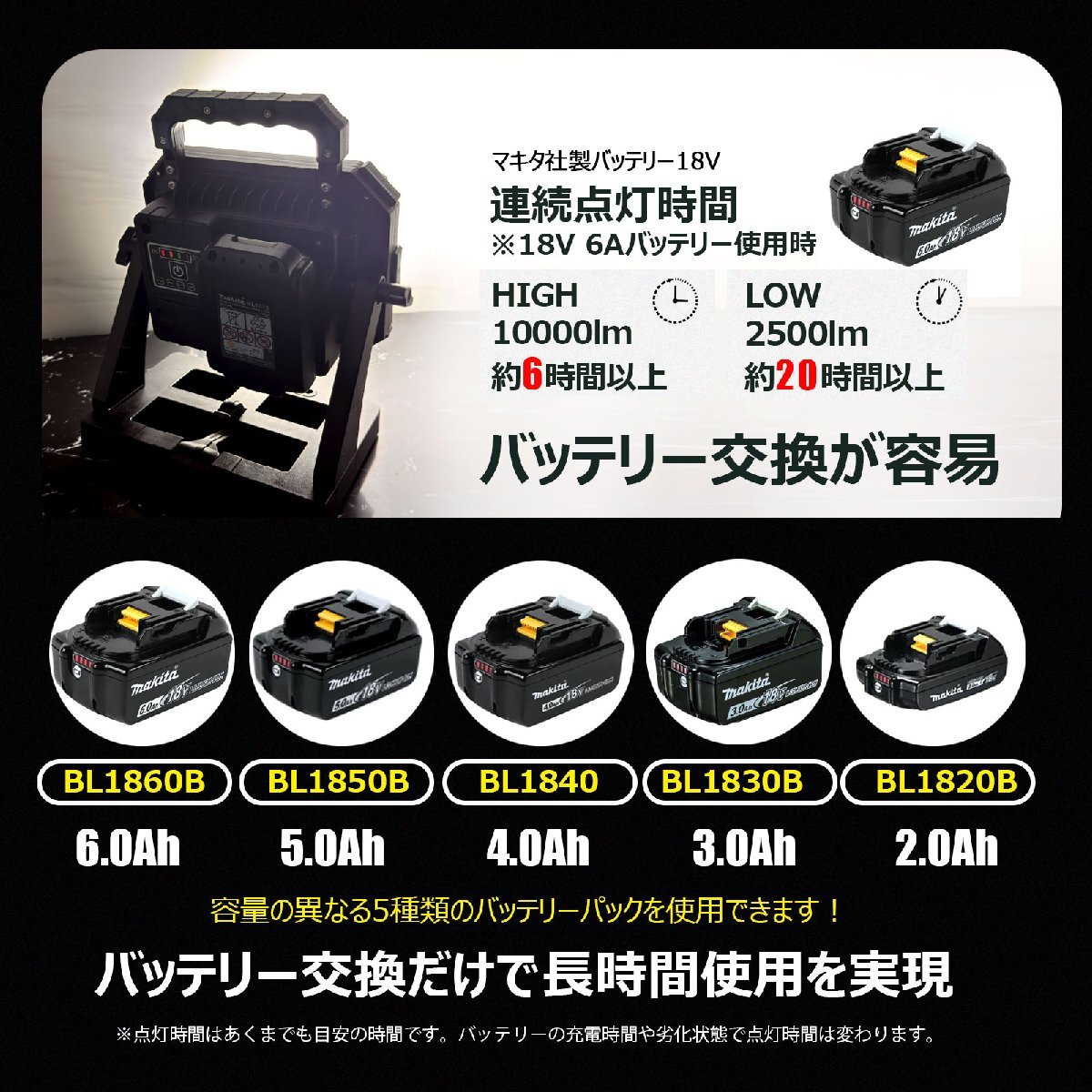 | 点灯モード | HIGH・MID・LOW・SOS(4段階) | 対応バッテリー | マキタ社製バッテリー18V 型番:BL1860B(6.0Ah)・BL1850B(5.0Ah) ・BL1850(5.0Ah)・BL1840(4.0Ah) ・BL1830B(3.0Ah)・BL1830 (3.0Ah) ※バッテリーは付属されません |