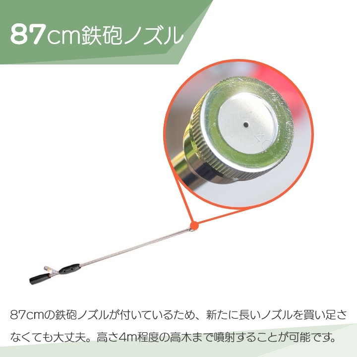 ■付属の鉄砲ノズルはグリップを回転させることで直射と拡散を切り替えれるので、高木の消毒から除草剤の散布まで幅広くご利用いただけます。