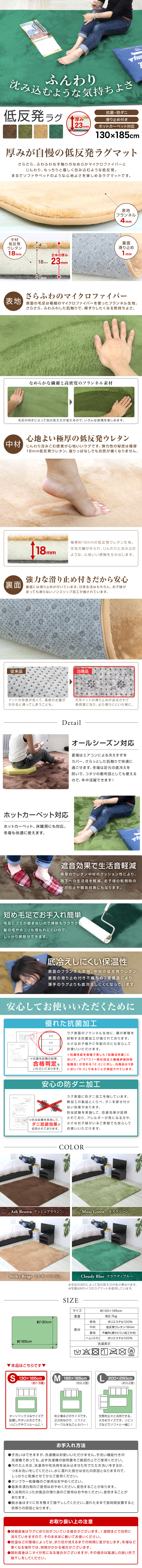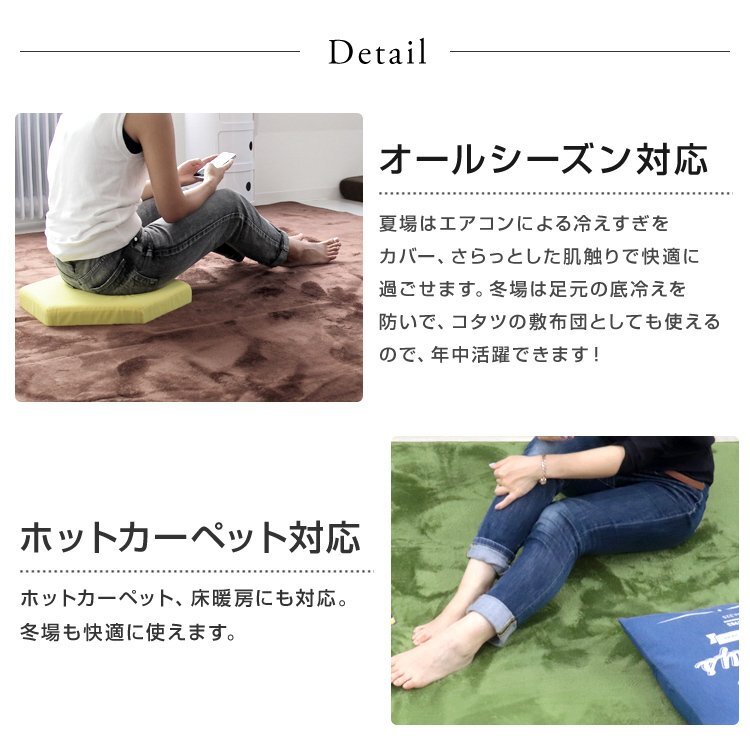 夏はサラッと、冬はあったか。 オールシーズン!快適に使えるラグマットです。 ソファーの前にテーブルを置いた際に使い勝手が良く、いろいろなタイプのお部屋に合わせやすいサイズです♪ 裏面にはゴム製の滑り止め加工が施してあり、フローリングに敷いても滑りにくく、小さなお子様やペットがいらっしゃるご家庭でも安心です! 毛足が短く、表面がサラサラなので簡単にお掃除ができ、洗濯機での丸洗いもできるのでいつでも清潔にご使用いただけます。 極厚のウレタン中材のクッション性により、階下への生活音を軽減。 床暖房やホットカーペットに対応しているので、なめらかな肌触りを1年中楽しむことができます!! 【商品仕様】 カラー:ミルキーベージュ サイズ(約):130×185cm 重量(約):2.7kg 素材: ・表地:ポリエステル100% ・中材:低反発ウレタン18mm ・裏面:不織布(滑り止め付) ・ヘム(ふち):ポリエステル100% |