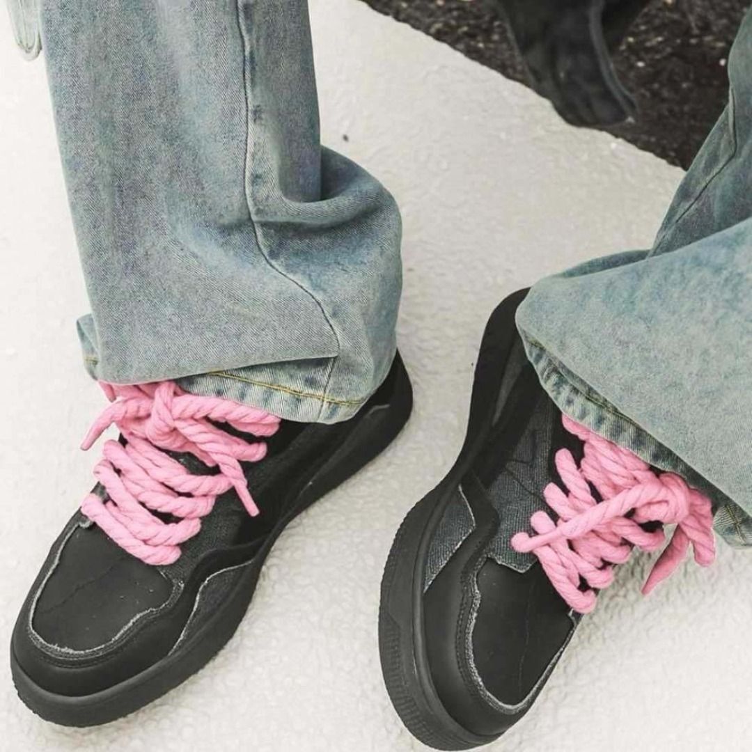 太めのシューレースに変えるだけで、いつものスニーカーがまるで別物のように印象チェンジ。