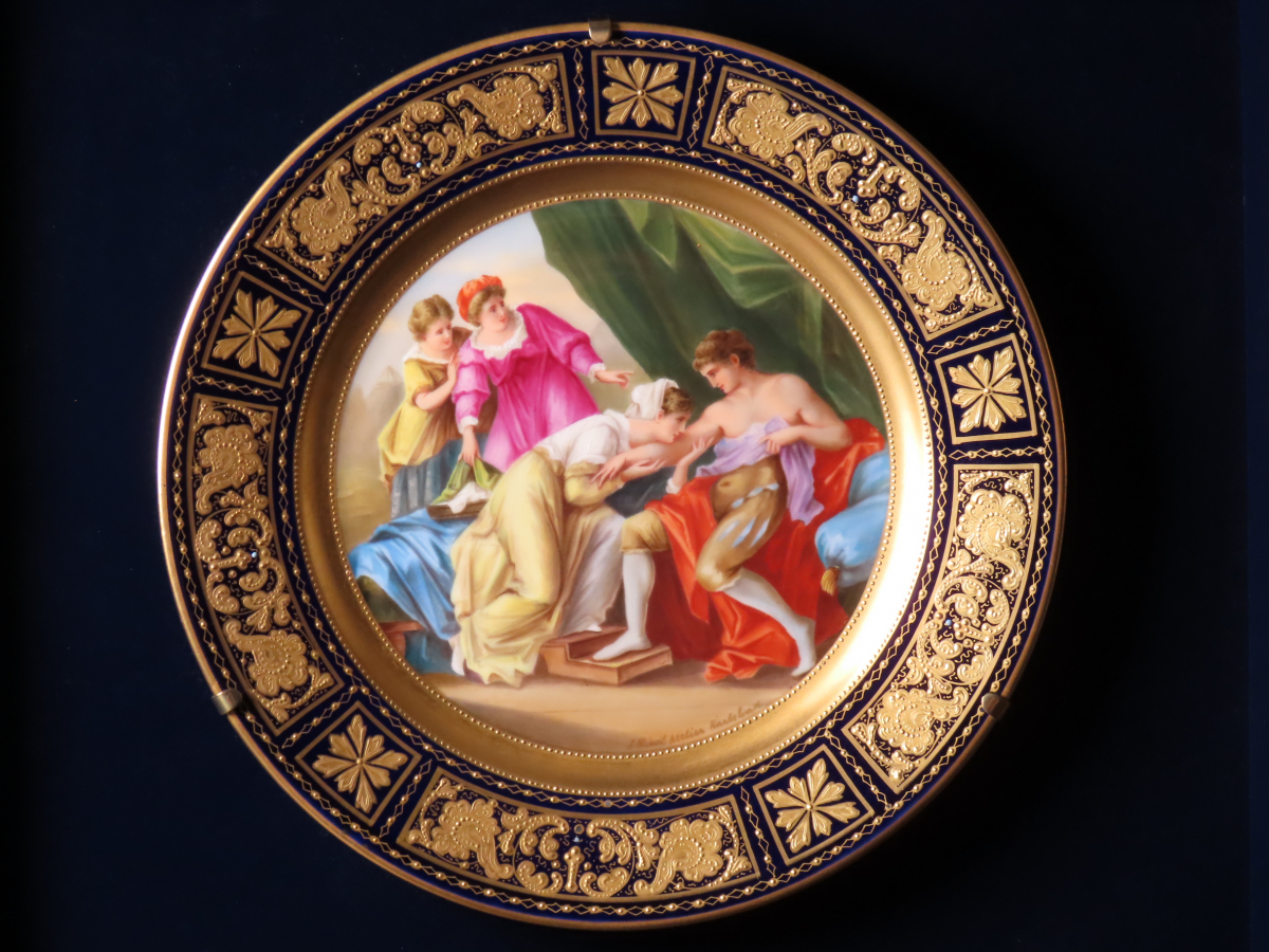 【ONE'S】19世紀 ウィーン窯 ROYAL VIENNA ロイヤル・ヴィエナ サイン入 『神話画』 コバルト地金彩飾皿 額装 タトウ箱付 西洋美術 | |||