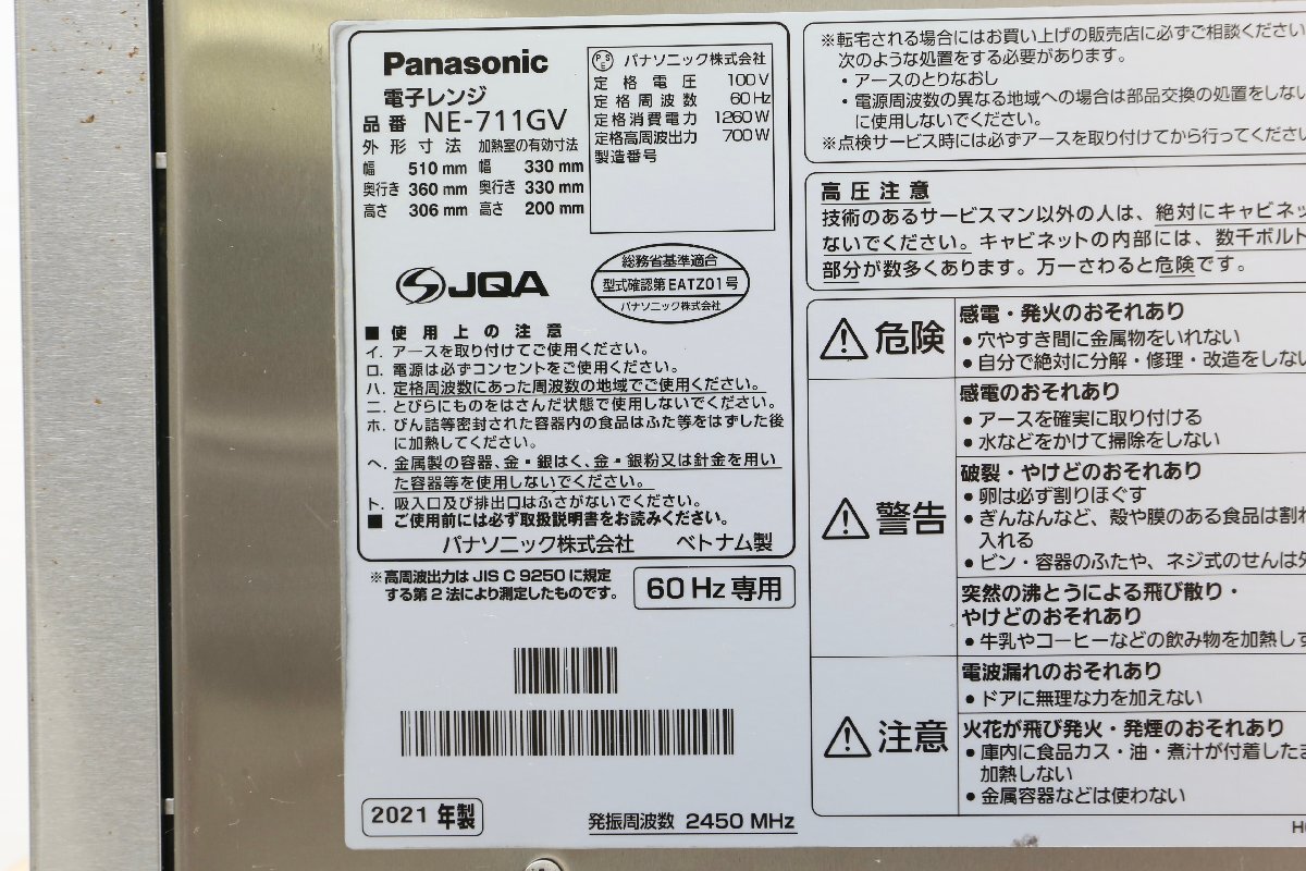 | メーカー | パナソニック株式会社 | 品名と形式 | 電子レンジ NE-711GV |