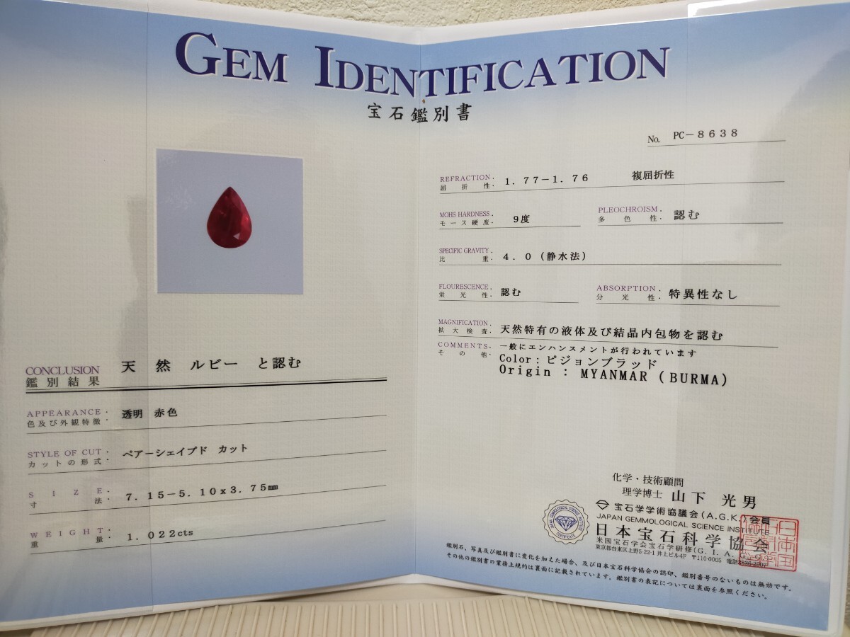 GIAにてピジョンブラッドの評定を得ているハートシェイプと比較しても極めて同じお色味となっております。※画像9枚目