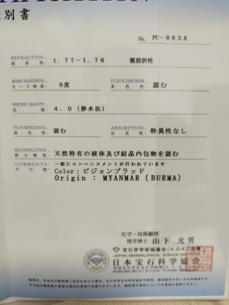 希少なビルマ産、ピジョンブラッド判定のルビーです。