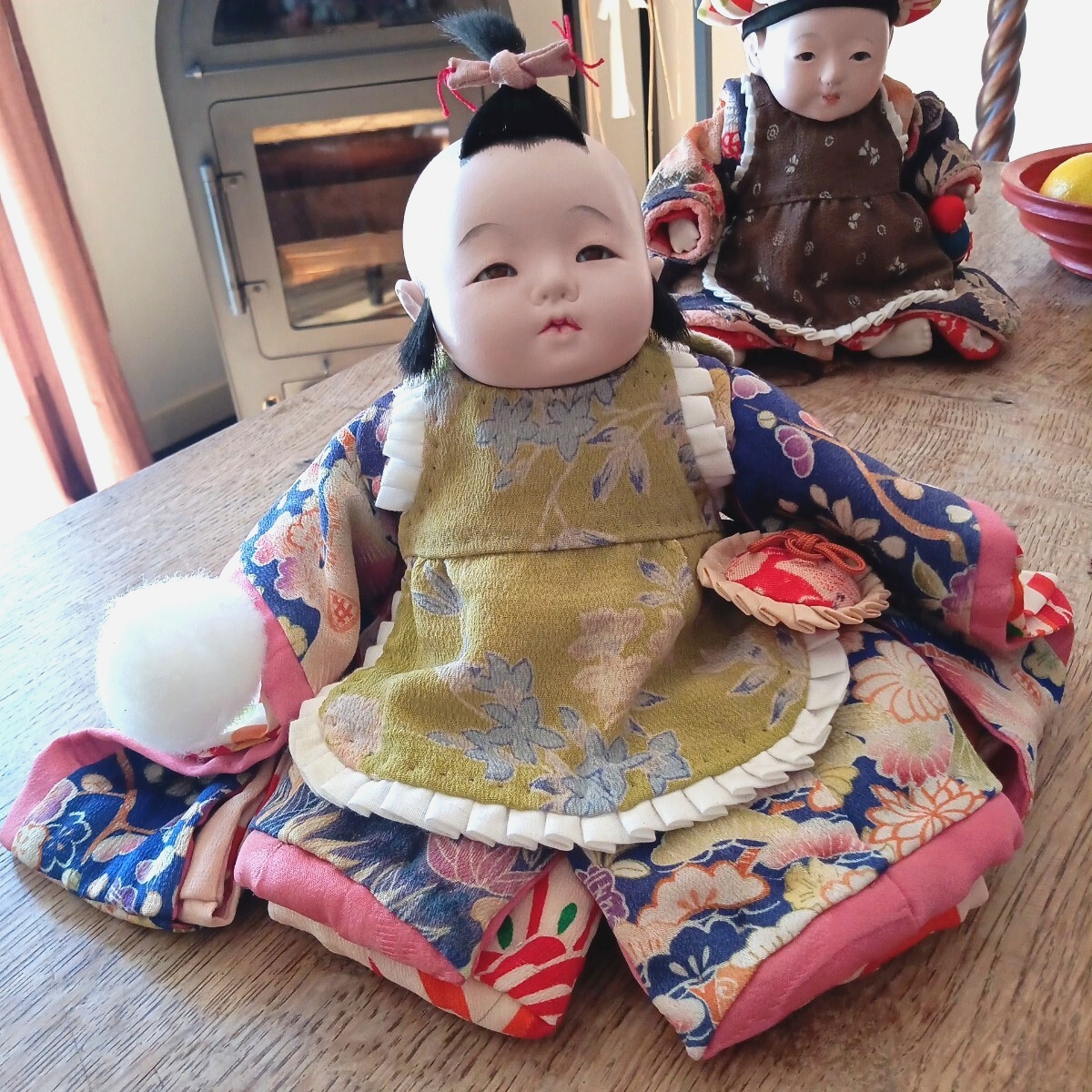 家にあった着物(購入したもの。気に入っていました。古い生地を使い丁寧に作られています)を着せ、エプロンや、提げ物(難避け桃と、巾着)、綿あめを作って身につけさせました。