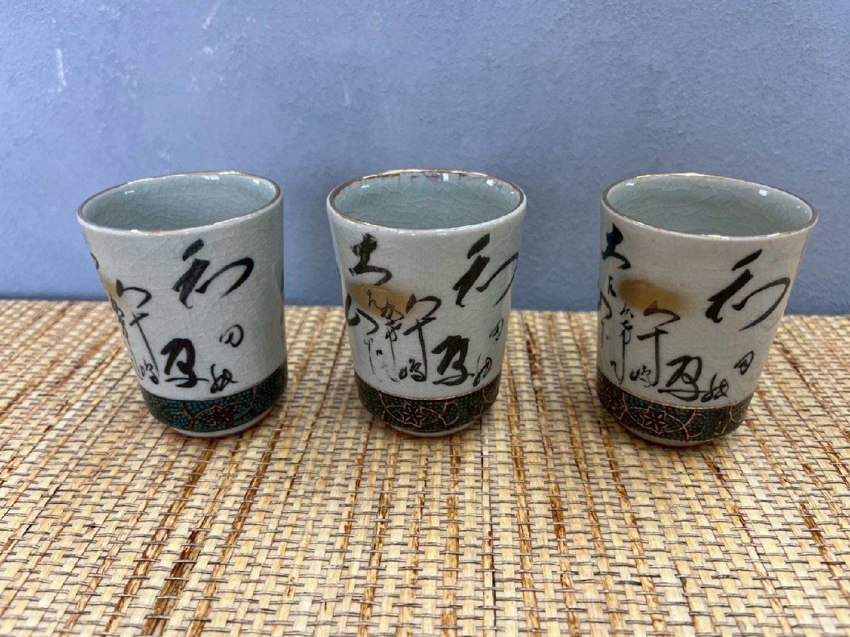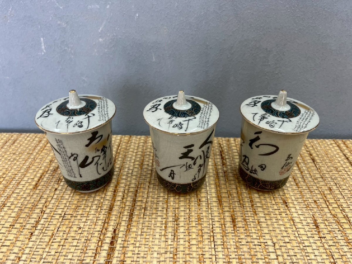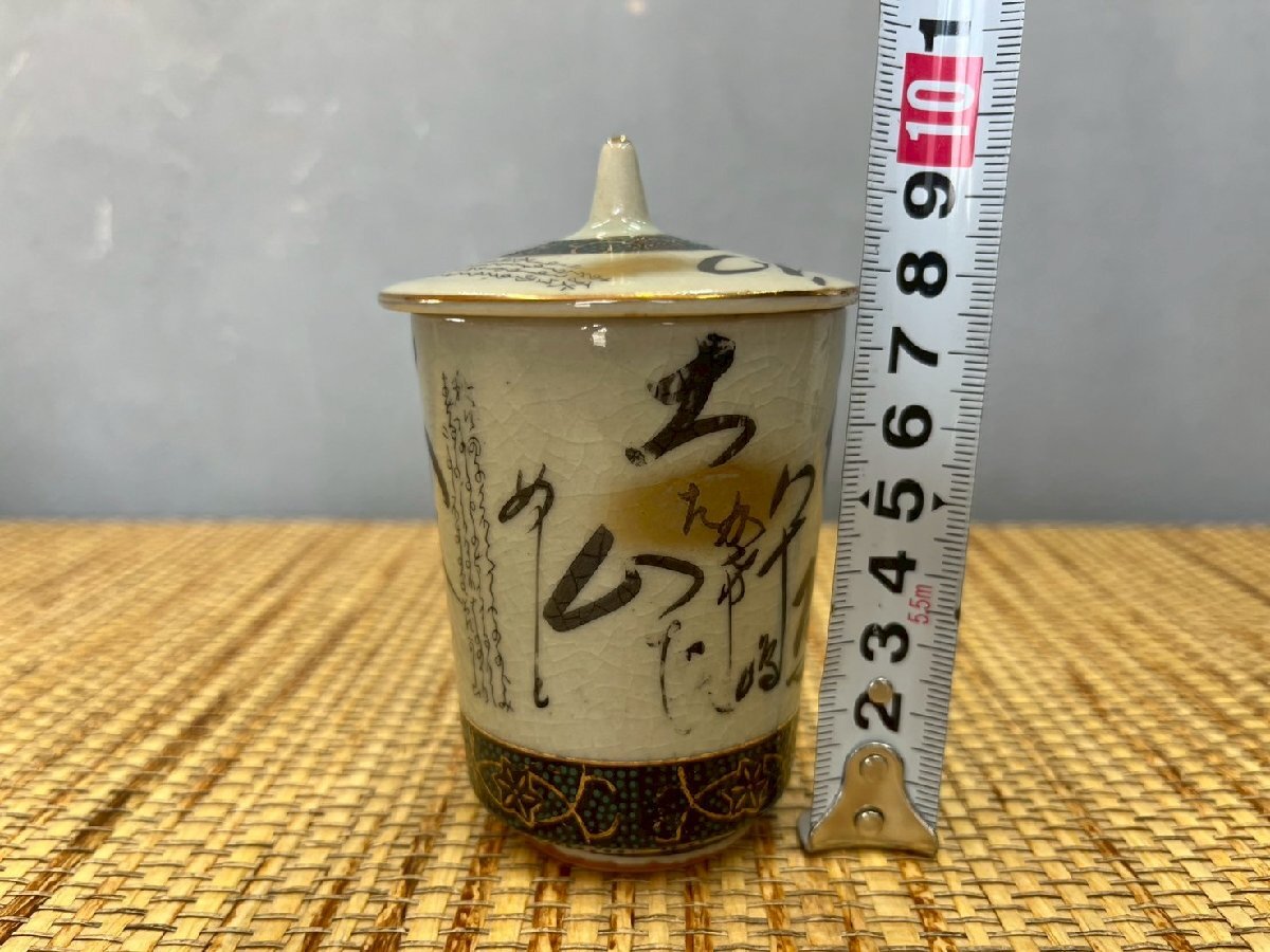 時代物 九谷焼 蓋つき湯飲み茶わん 湯呑 玉仙 3客