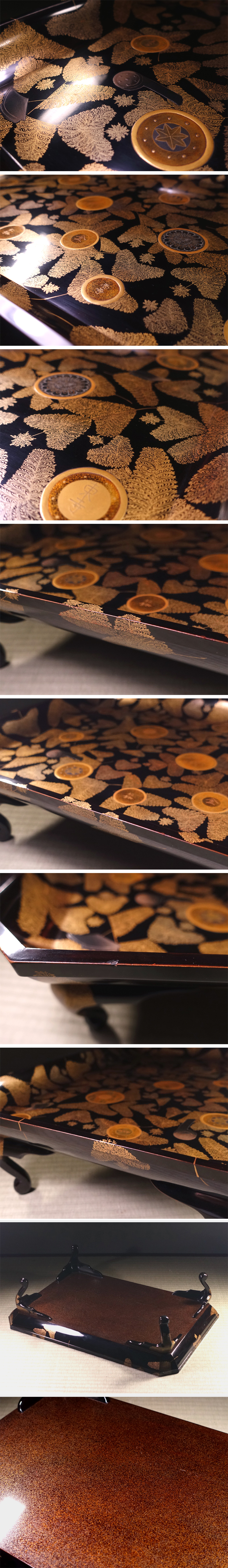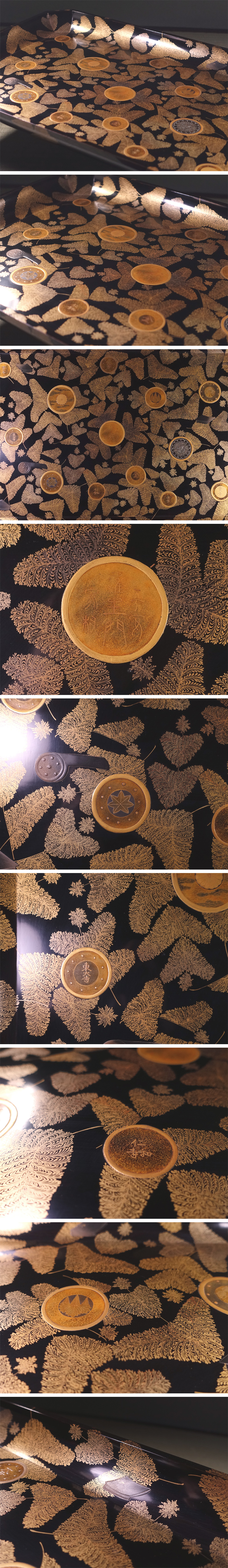 本作は東大寺や仁和寺などの古瓦をモチーフ化して散らし配し、隙間を埋め尽くすほどの山草(羊歯)が本金蒔絵を用いて緻密に描かれています。