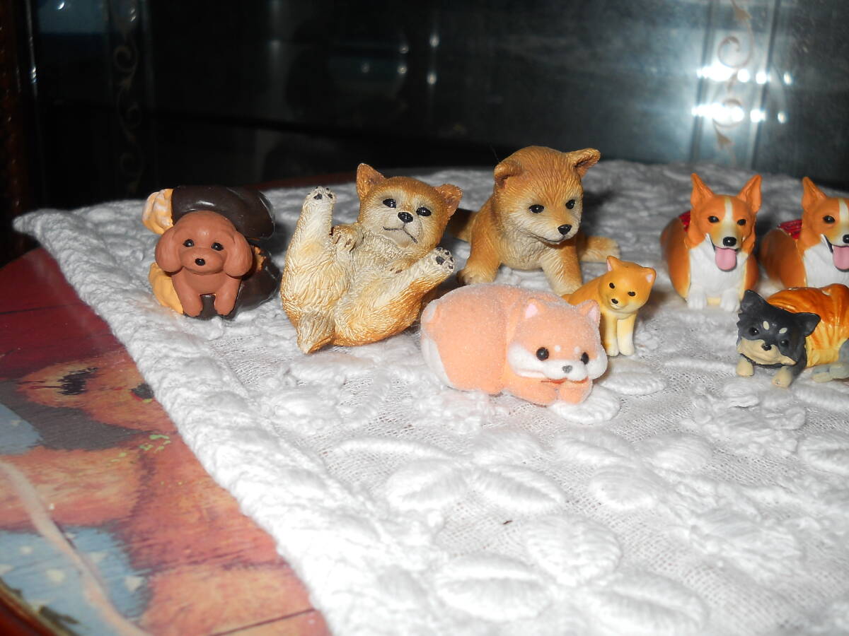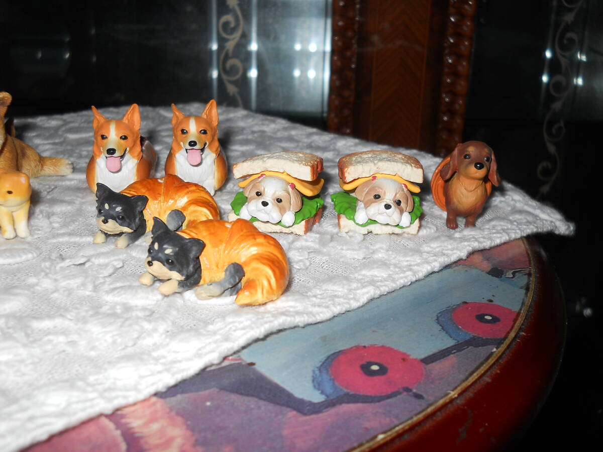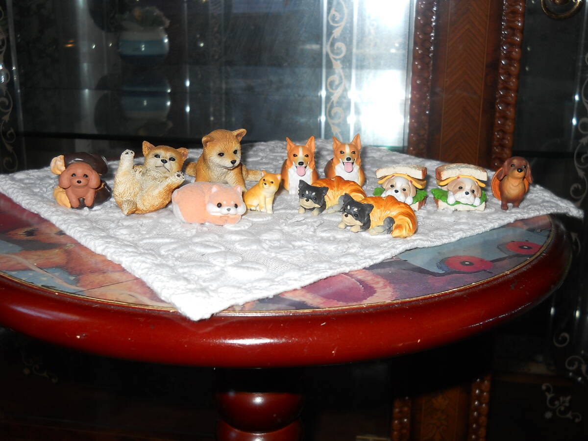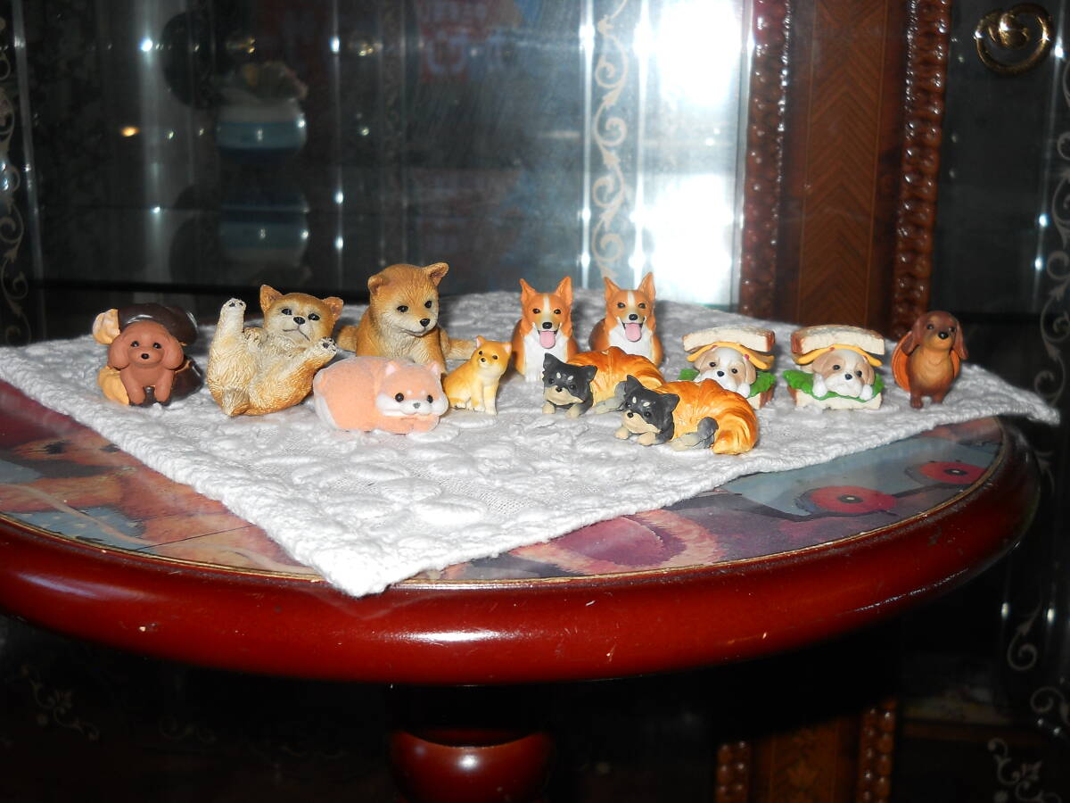 犬パンのガチャガチャと柴犬のフィギュアです。クロワッサンチワワ2個、ホットドッグコーギー2個、チーズバーガーシーズー2個、チュロスダックス1個、ドーナツトイプードル1個、柴犬4個です。キーチェンは全部外して飾っていました。