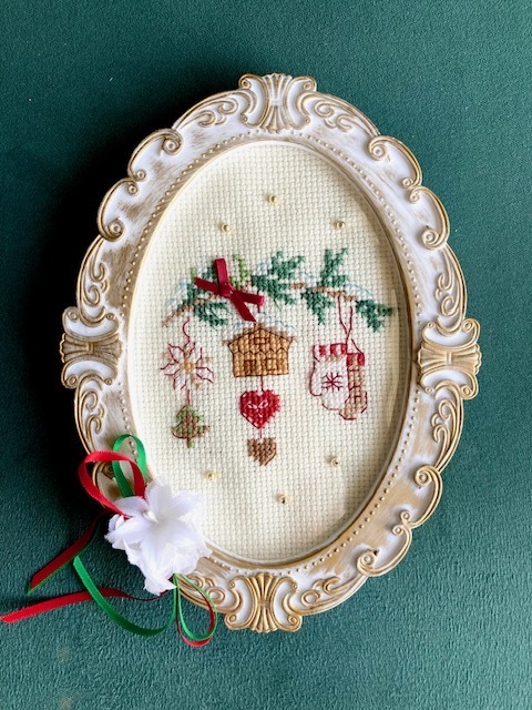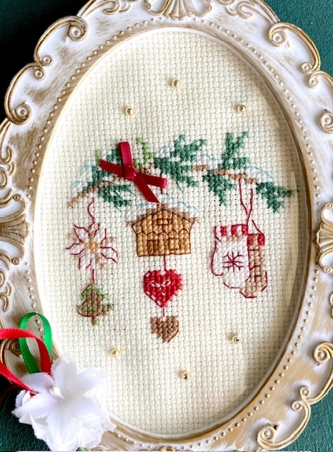 クリスマス・柊の枝の小さなオーナメント・クロスステッチ・ハンドメイド・フレーム入り