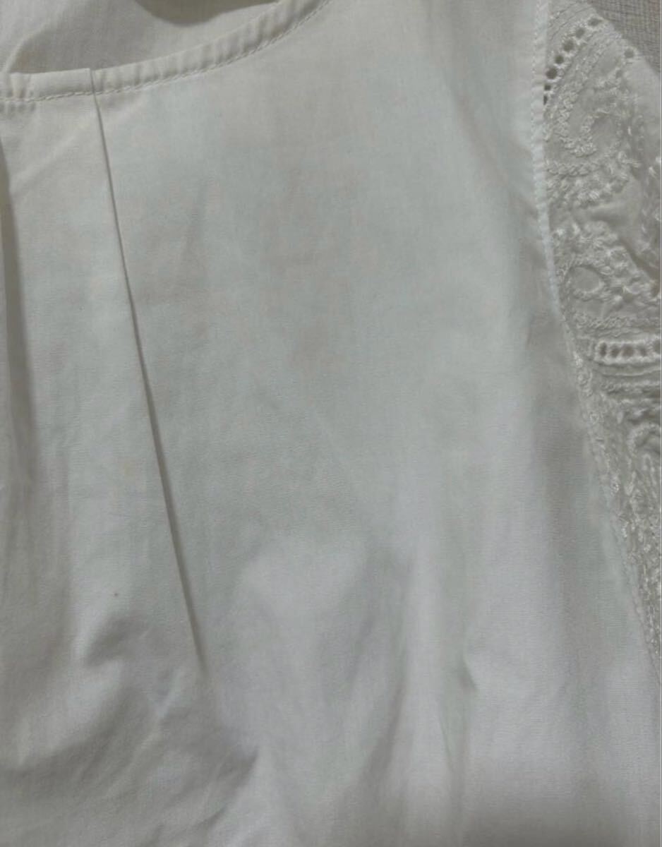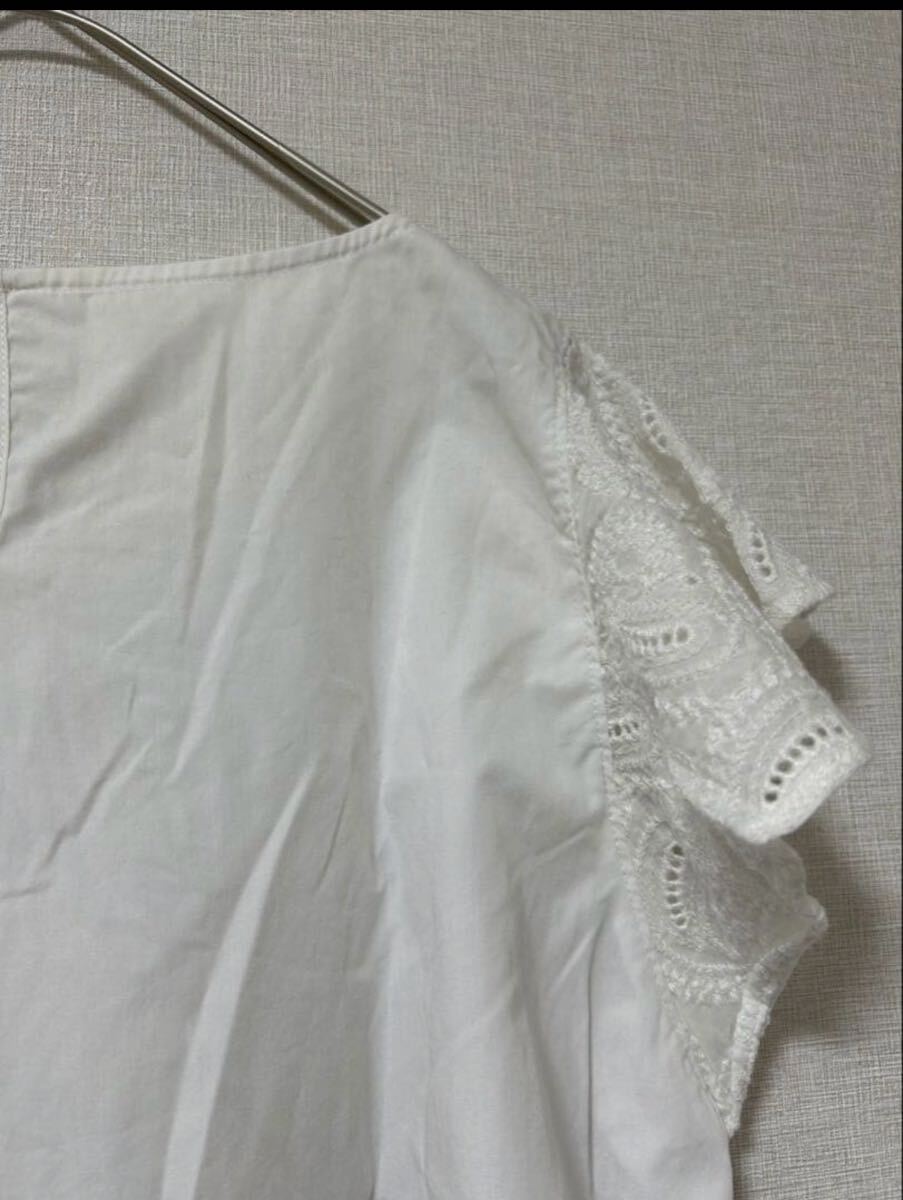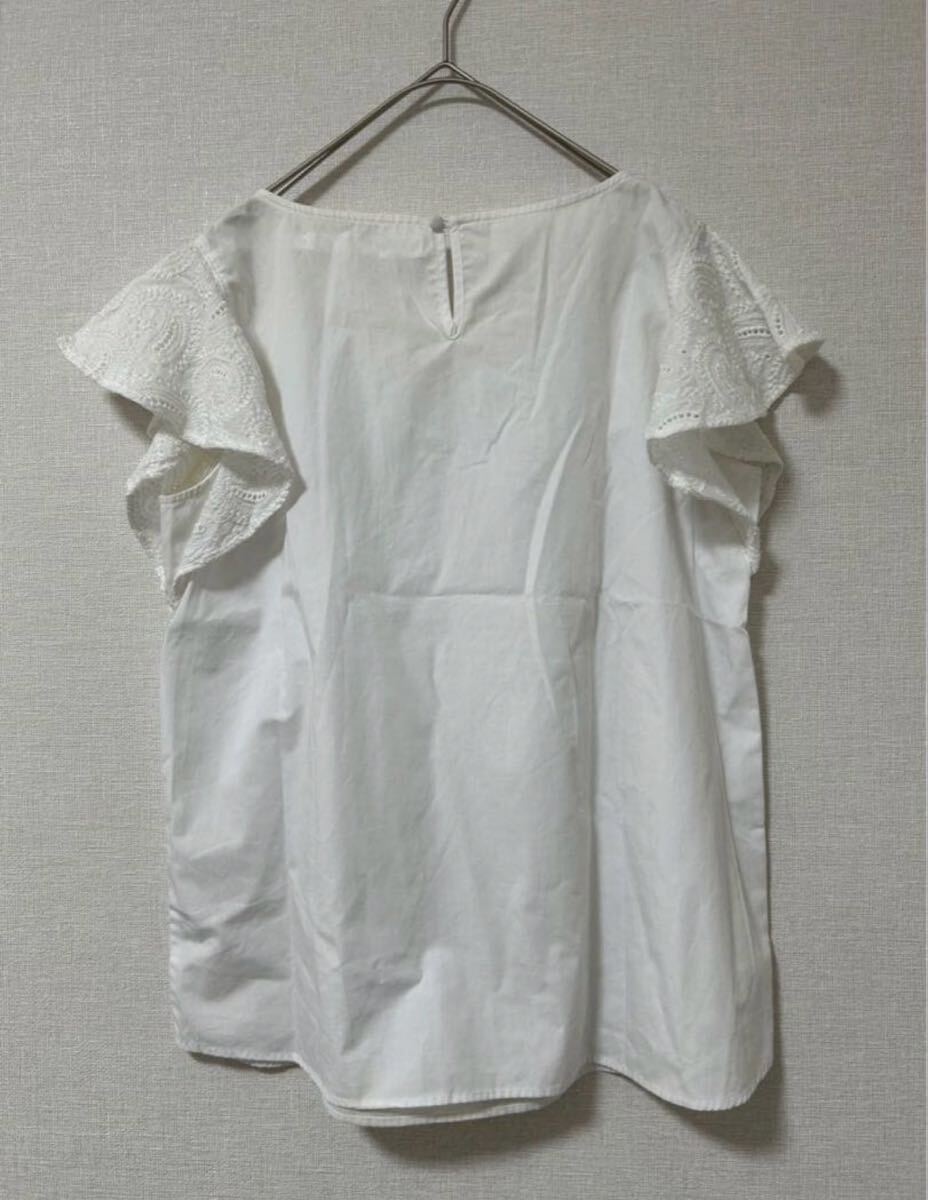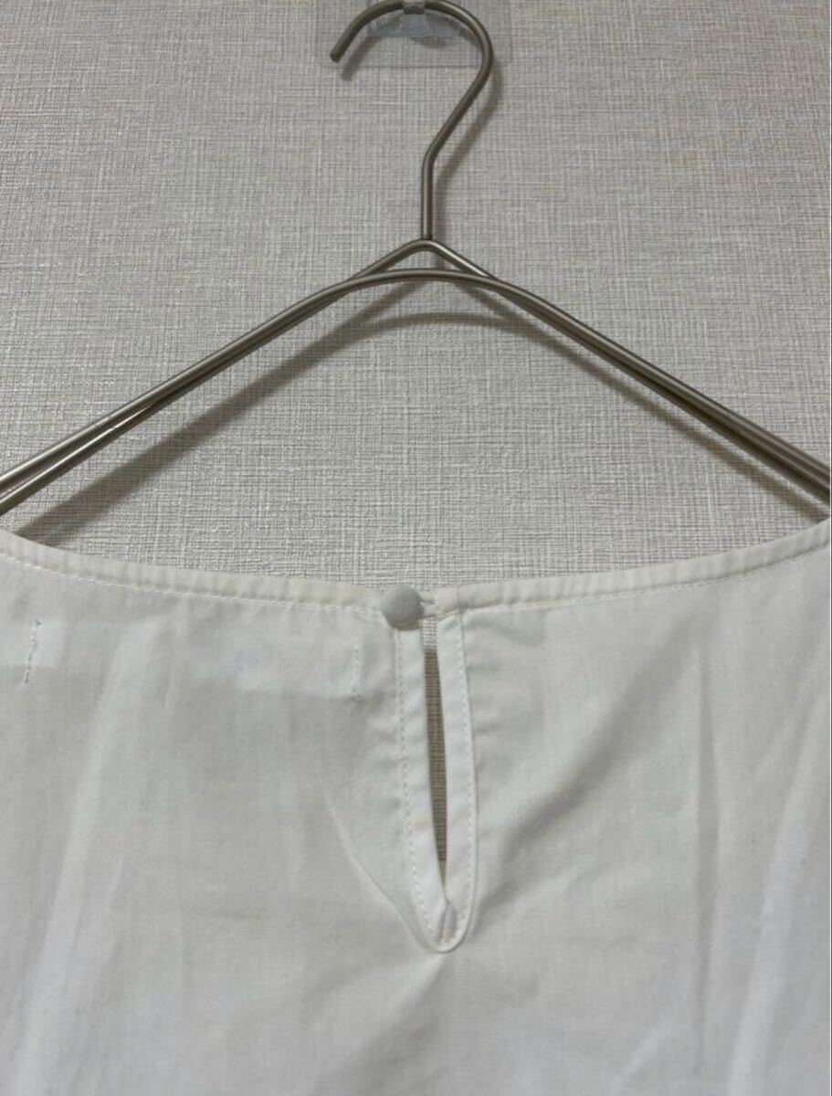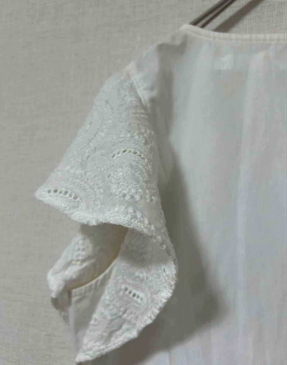 レース袖のホワイトプルオーバー、バックボタン付き。