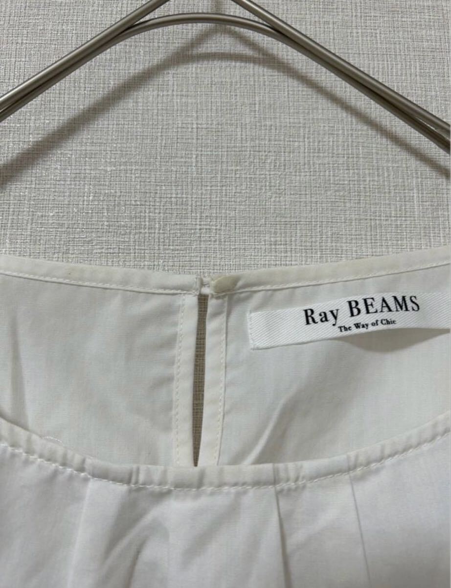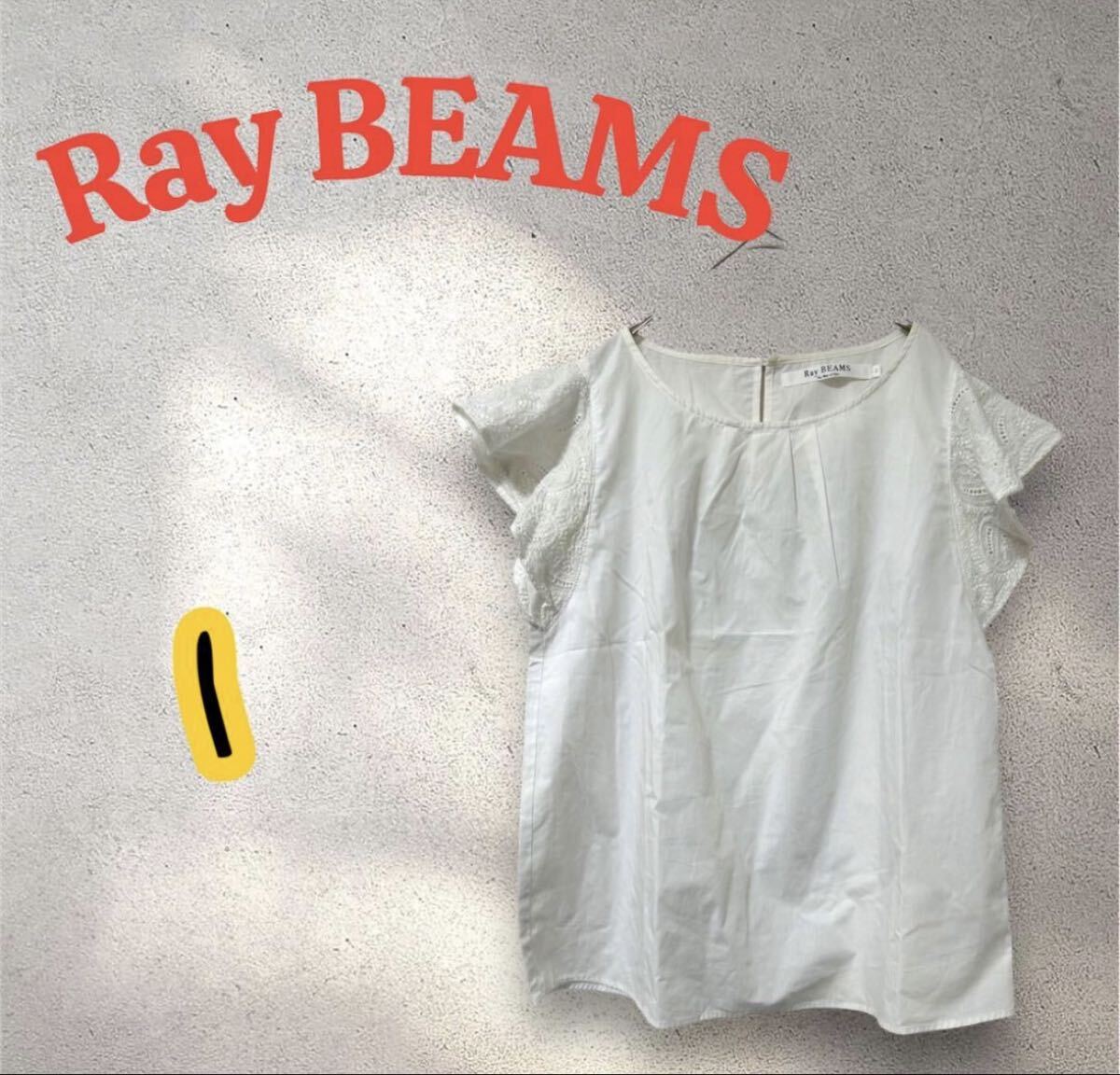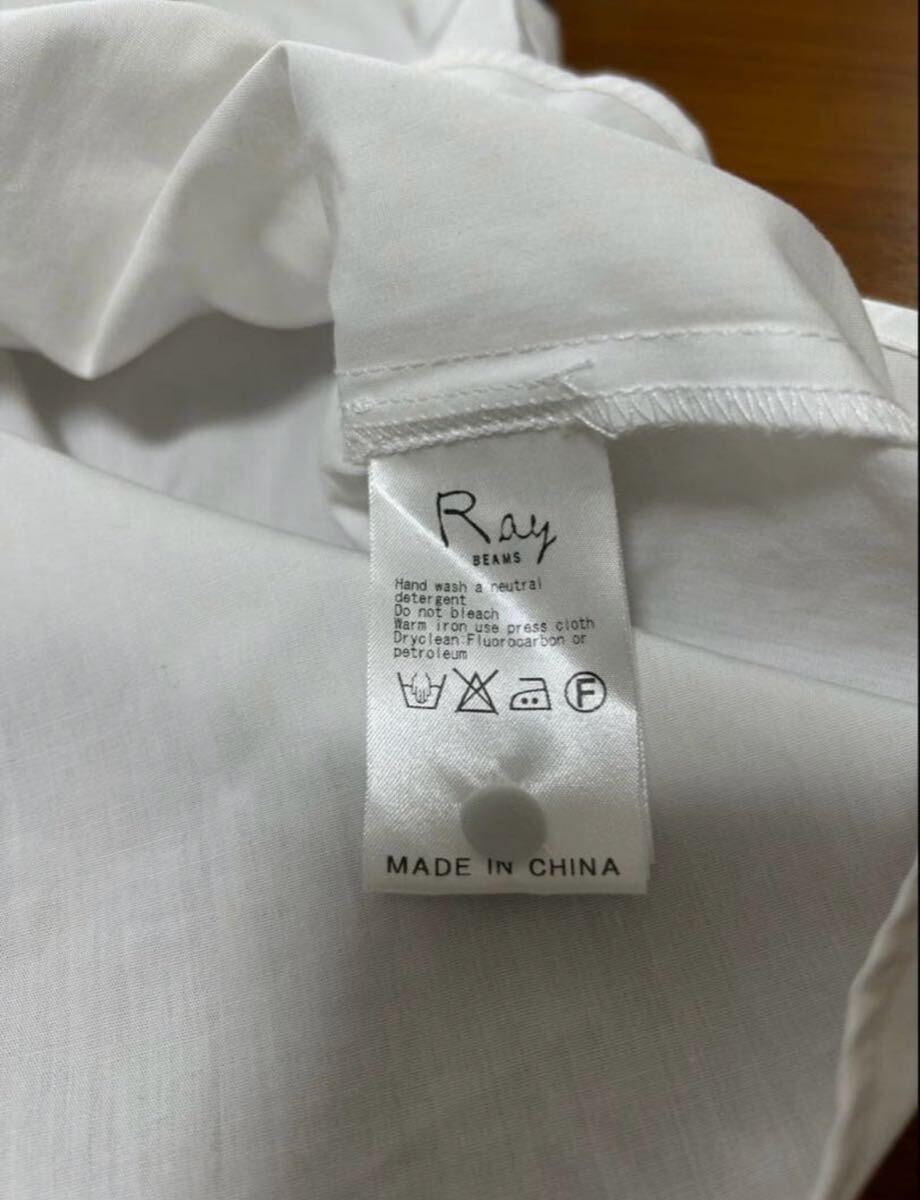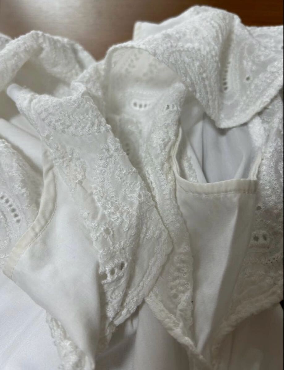 レース袖のホワイトプルオーバー、バックボタン付き。
