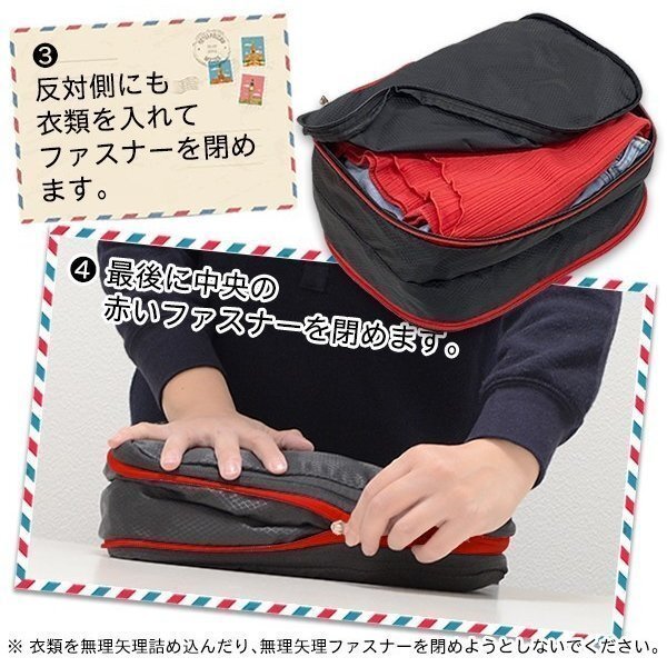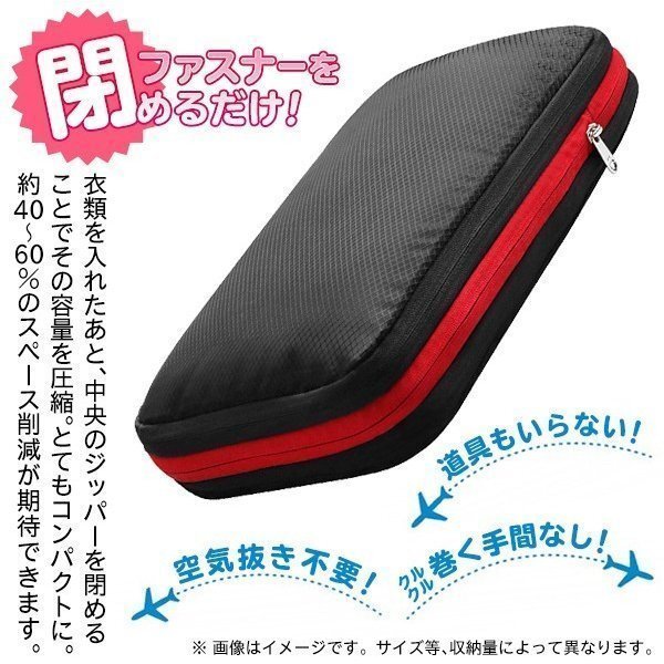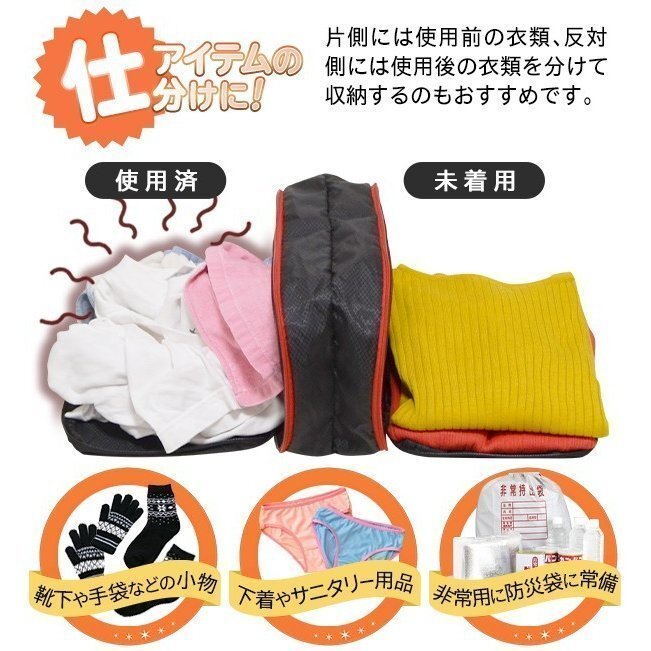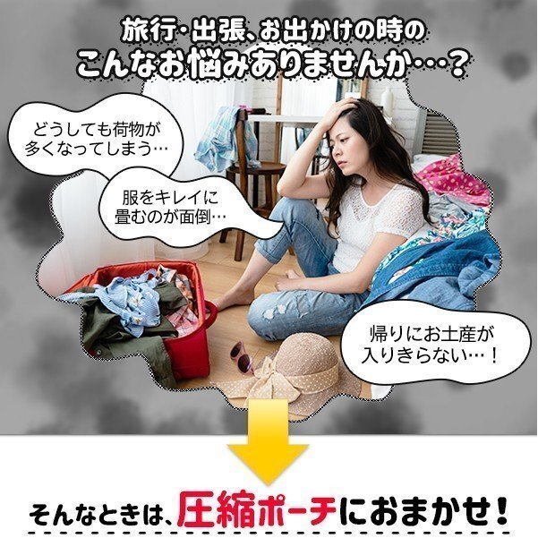 | 衣類を入れてファスナーを閉めるだけ。 かさばる衣類が圧縮される!スーツケースの中もスッキリするポーチ! 圧縮袋のように巻いたり、空気を押し出したりする手間なし! 衣類を入れたあと、周囲のジッパーを閉めることでその容量を圧縮。 収納する量にもよりますが、およそ40~60%ほどのスペース削減が期待できます。 収納スペースは2室で、どちらにも衣類を入れて最後に真ん中についている ファスナーを閉めたら圧縮完了。巻いて空気を抜く手間も無く、掃除機などでの 吸引も不要!出発前ギリギリ!そんなときでもパパっと荷造り♪ 片側には「使用前の衣類」、もう片方には「使用後の衣類」というように 分けて収納するのも◎ インナーや靴下などの小物でもまとめてスッキリ☆ 中身が見えないので下着やサニタリーグッズも安心して入れられます。 非常時のために、衣類を入れて防災袋に常備するのもGOOD◎ 外側は撥水加工がされており、水しぶきや水滴に対応。 タオルなどを入れて、ビーチやプールサイドに持って出ることもできます。 洗面所やシャワー室にも安心して持って行けますね♪ 小さなお子様の着替えやおむつを入れる、おむつポーチにもおススメ! 紙パンツのBigサイズでも5枚+おしりふき+着替え+お食事スタイ+タオル などのおでかけ用品・保育園一日分がかさばらず入ります♪ ママも育メンパパも荷物がスッキリしますよ! 旅行や出張のとき、どうしても荷物が多くなってしまう・・・ 服を畳むのが面倒で荷造りが苦手・・・ 帰りにお土産を入れるスペースが無い・・・(T_T)!そんな方ももう安心! この圧縮ポーチさえあれば荷物が少なくなり、スペースを確保できます! あら、ちょっと服を入れすぎたな・・・ そんなときには最後の中央のファスナーを閉めないで使ってもOKです◎ |