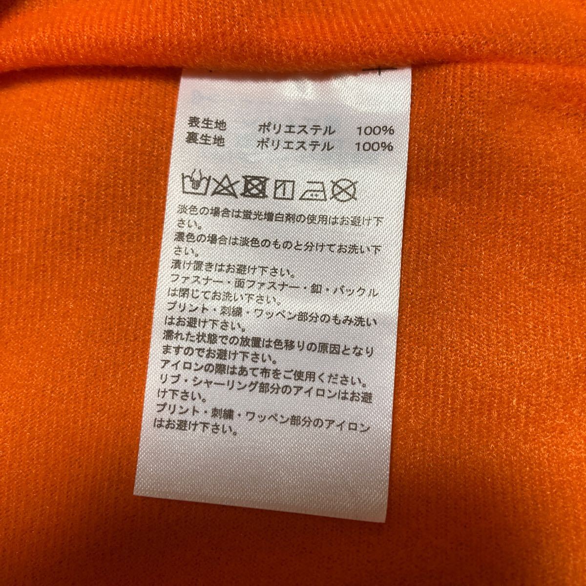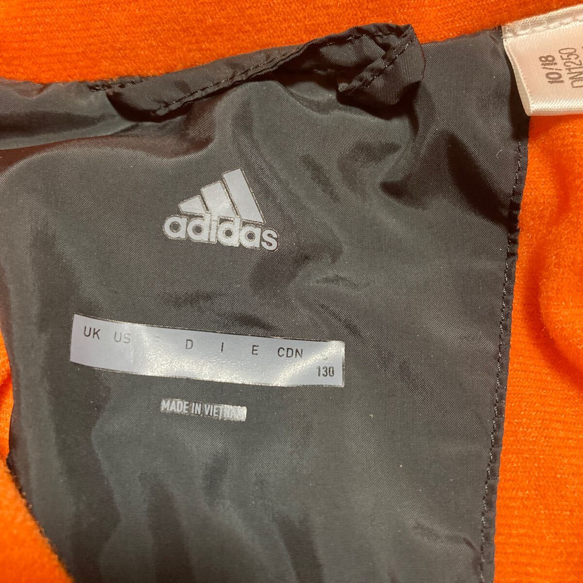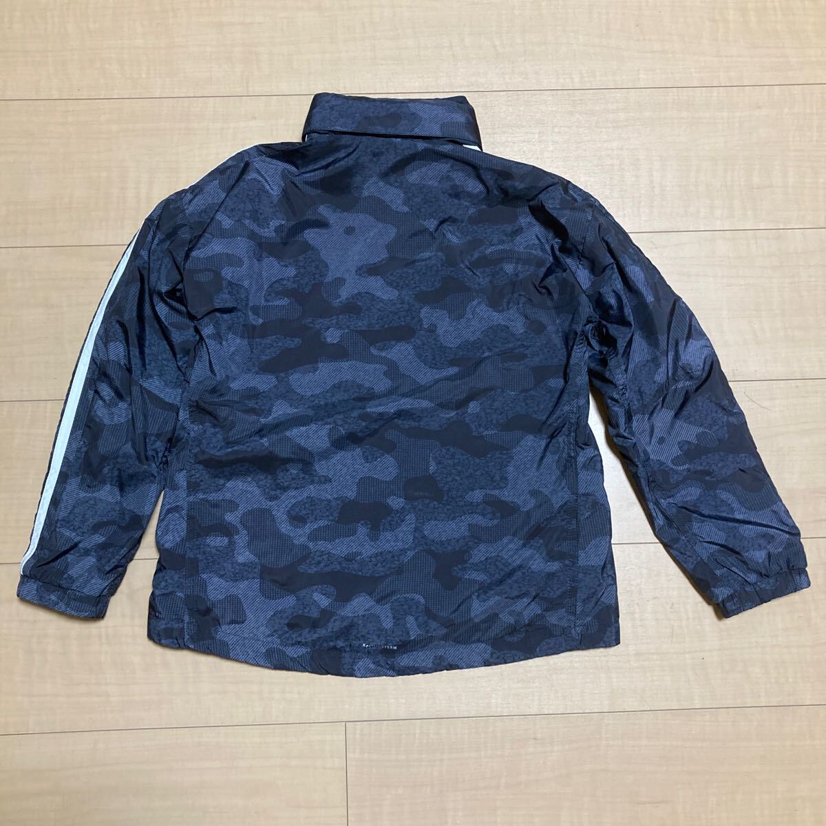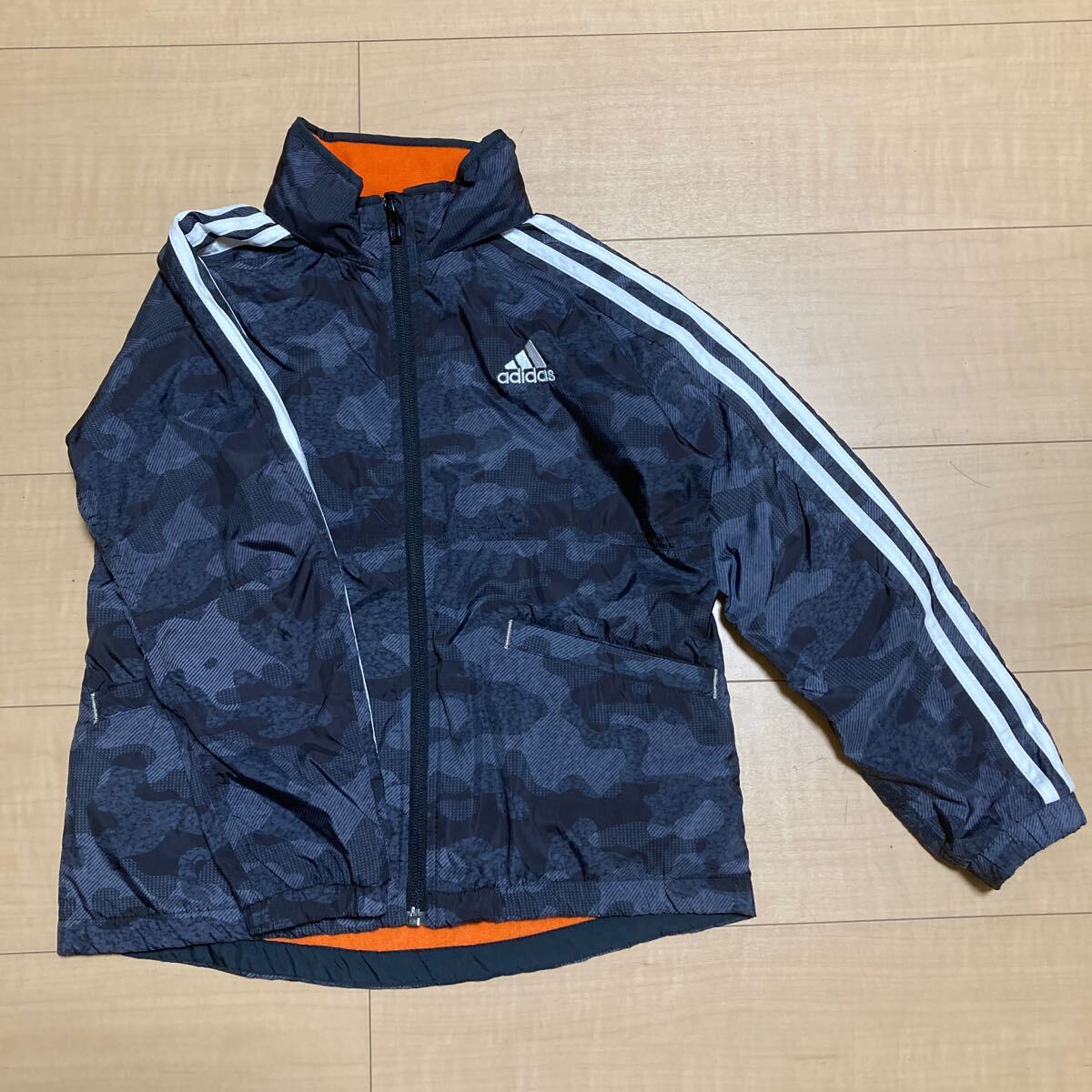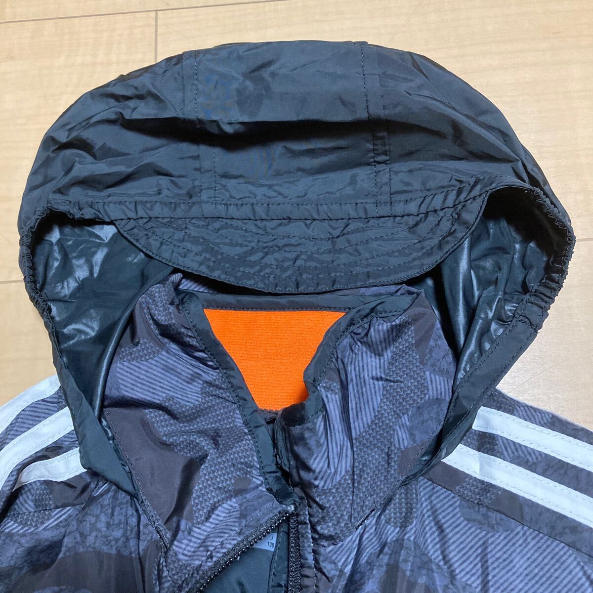 adidasのウインドブレーカー、サイズは130センチです。首元にツバ付きのフードが収納されています。