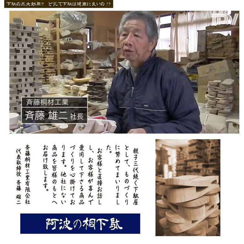 古くより地域に伝わる伝統産業である桐下駄の製造技術と商品に、 洋服にも映える阿波の桐下駄を企画いたしました。 ファッションに関心のある人びとにデザイン性豊かな桐下駄を。 ■太古の歴史を持ち今日に伝わる下駄のその一大産地・阿波三加茂。 昭和25年当時では70軒もの製造業者が軒を連ねていたといいます。 原料不足響、洋風履物の隆盛などにより、下火となっていくのですが、 斎藤桐工業のつくる下駄はその品質の高さから皆様に愛され、 現在は県内に一軒のみの製造工場となりました。 日本一の桐下駄職人の造る下駄は確かな品質です。 | |