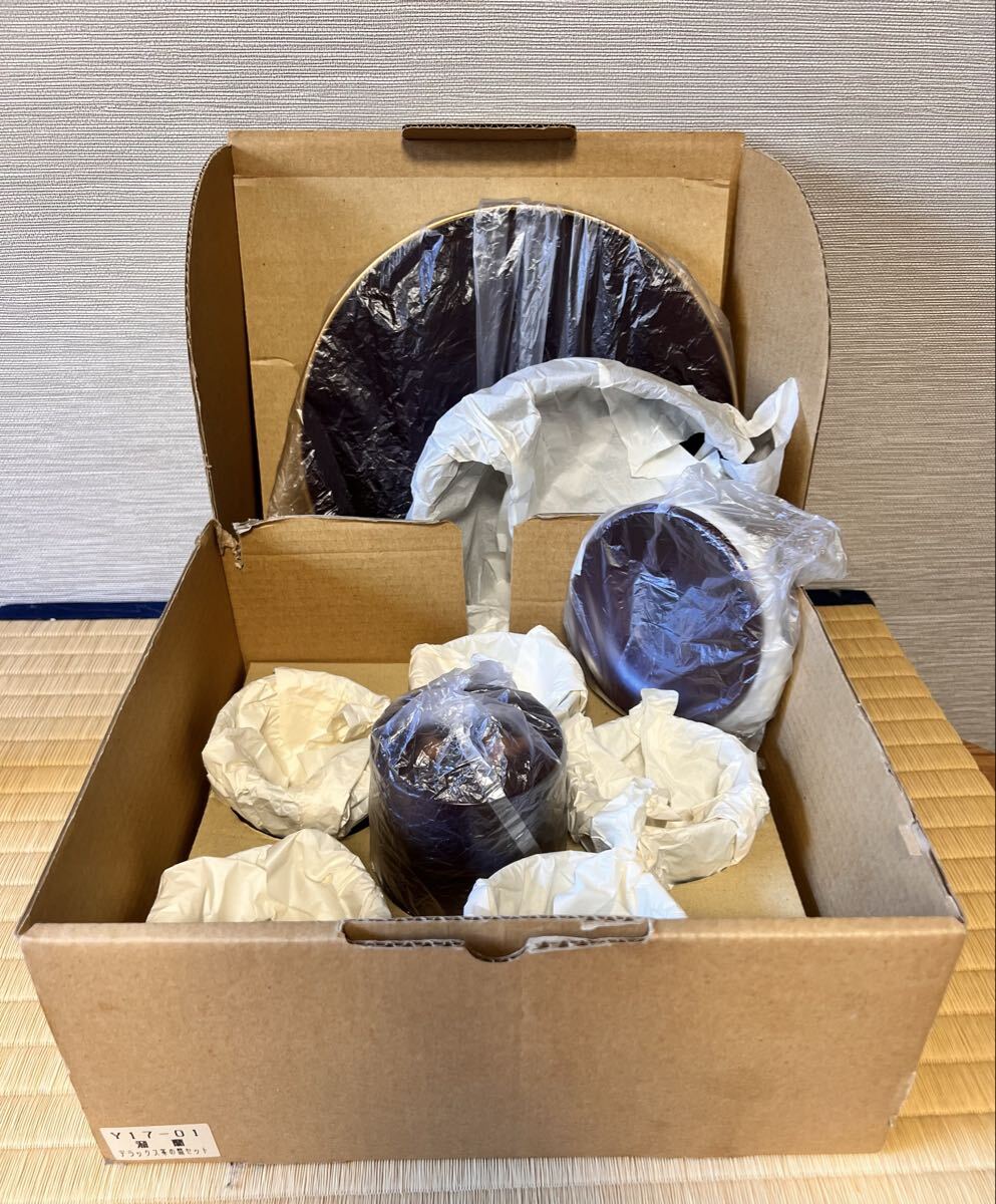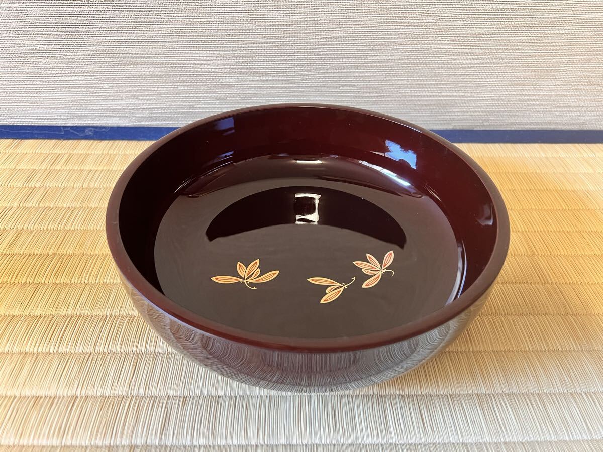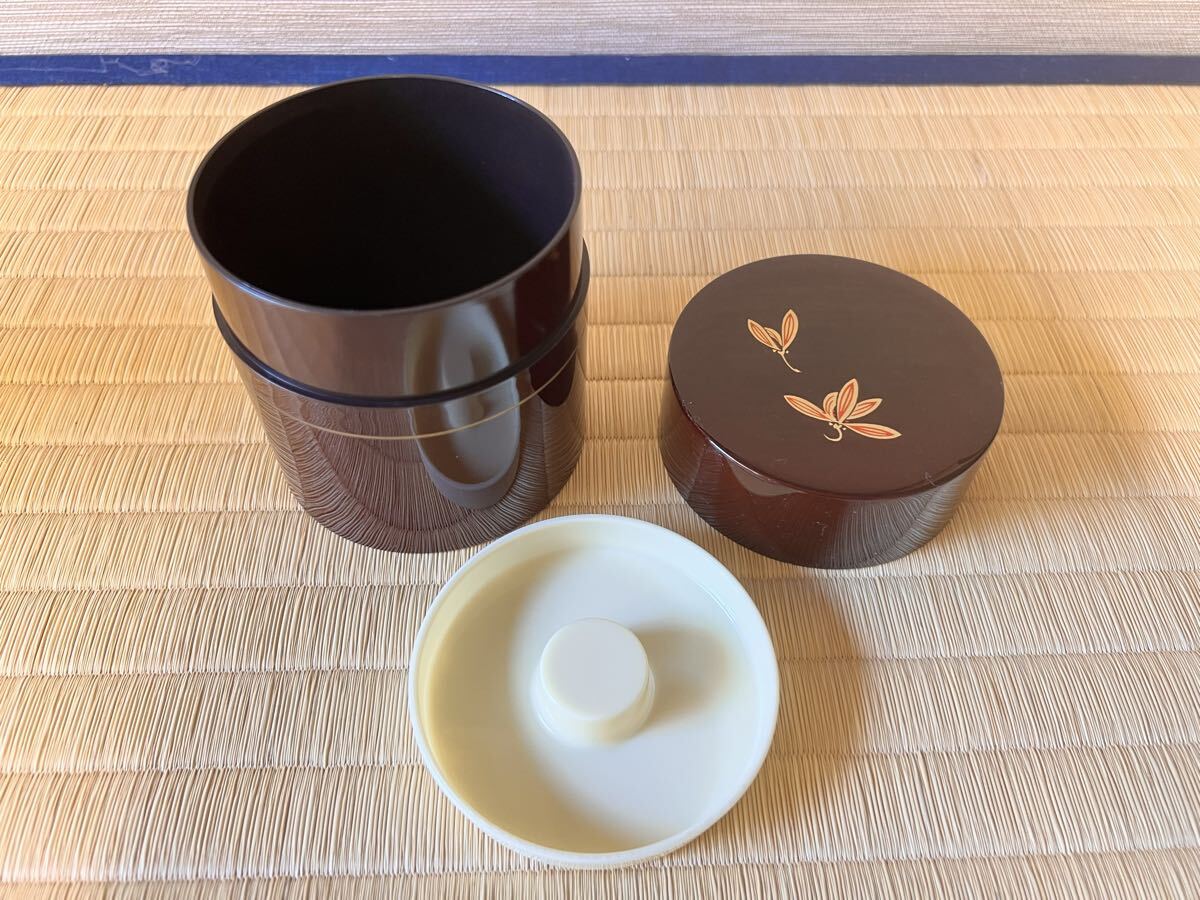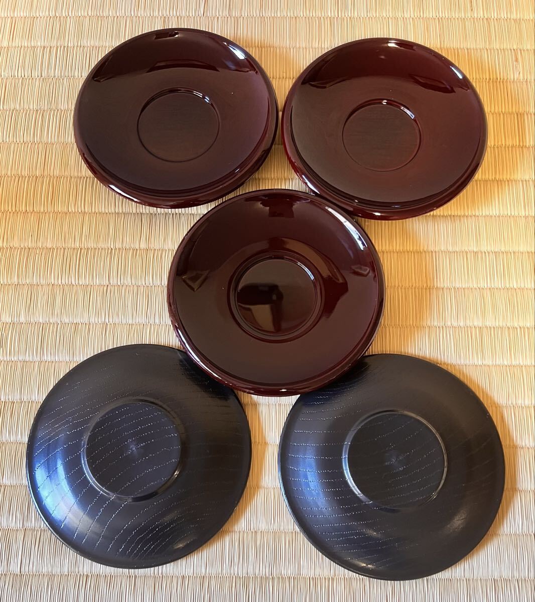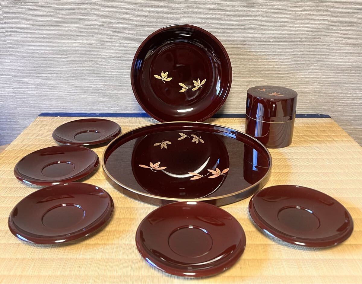 :塗装された盆、菓子器、茶托、茶筒の素材は木製か、樹脂か不明です