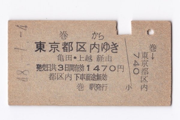 ●国鉄●越後線【 巻から東京都区内ゆき 亀田・上越線経由 1470円 】A型券 昭和48年 巻駅発行【00053】