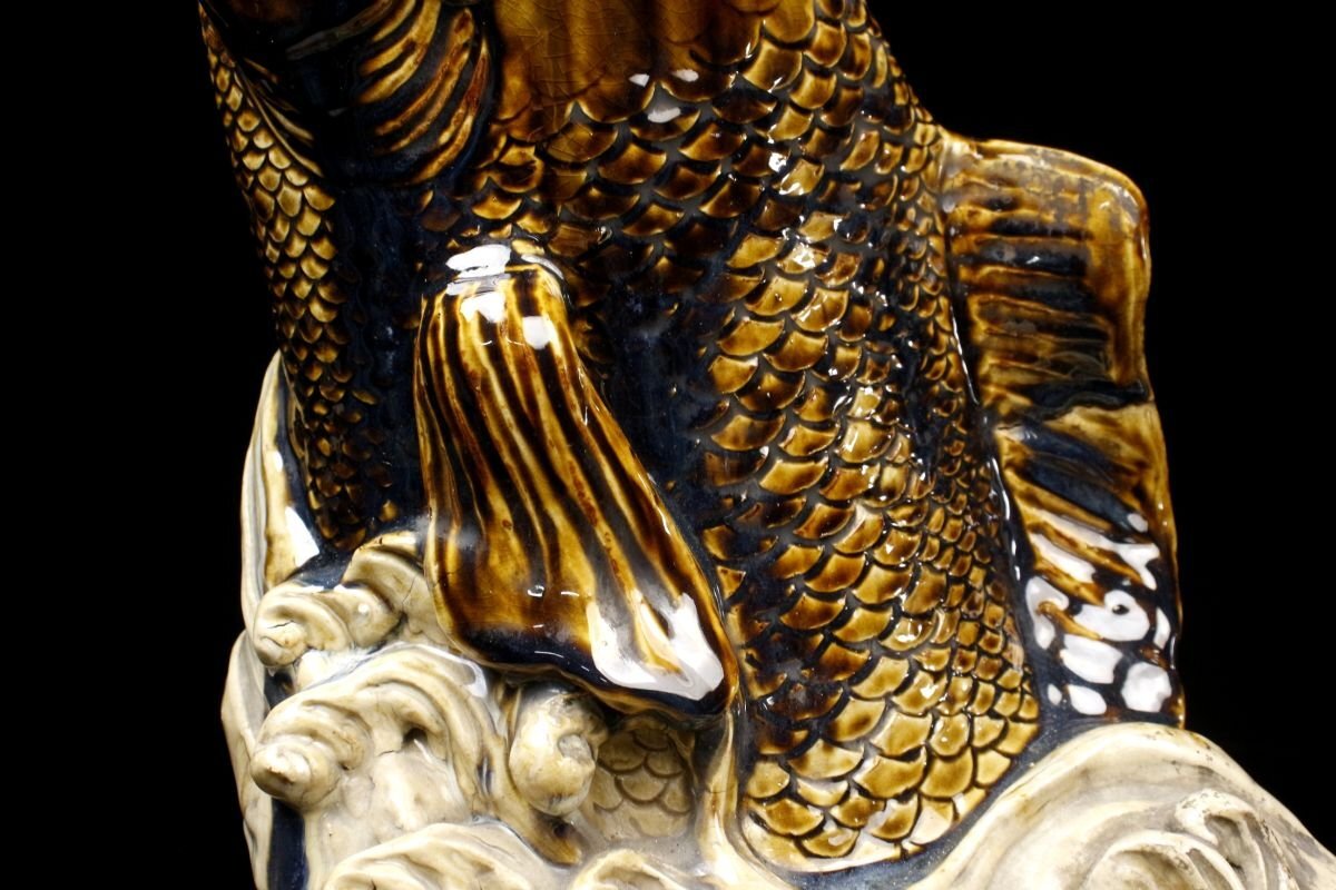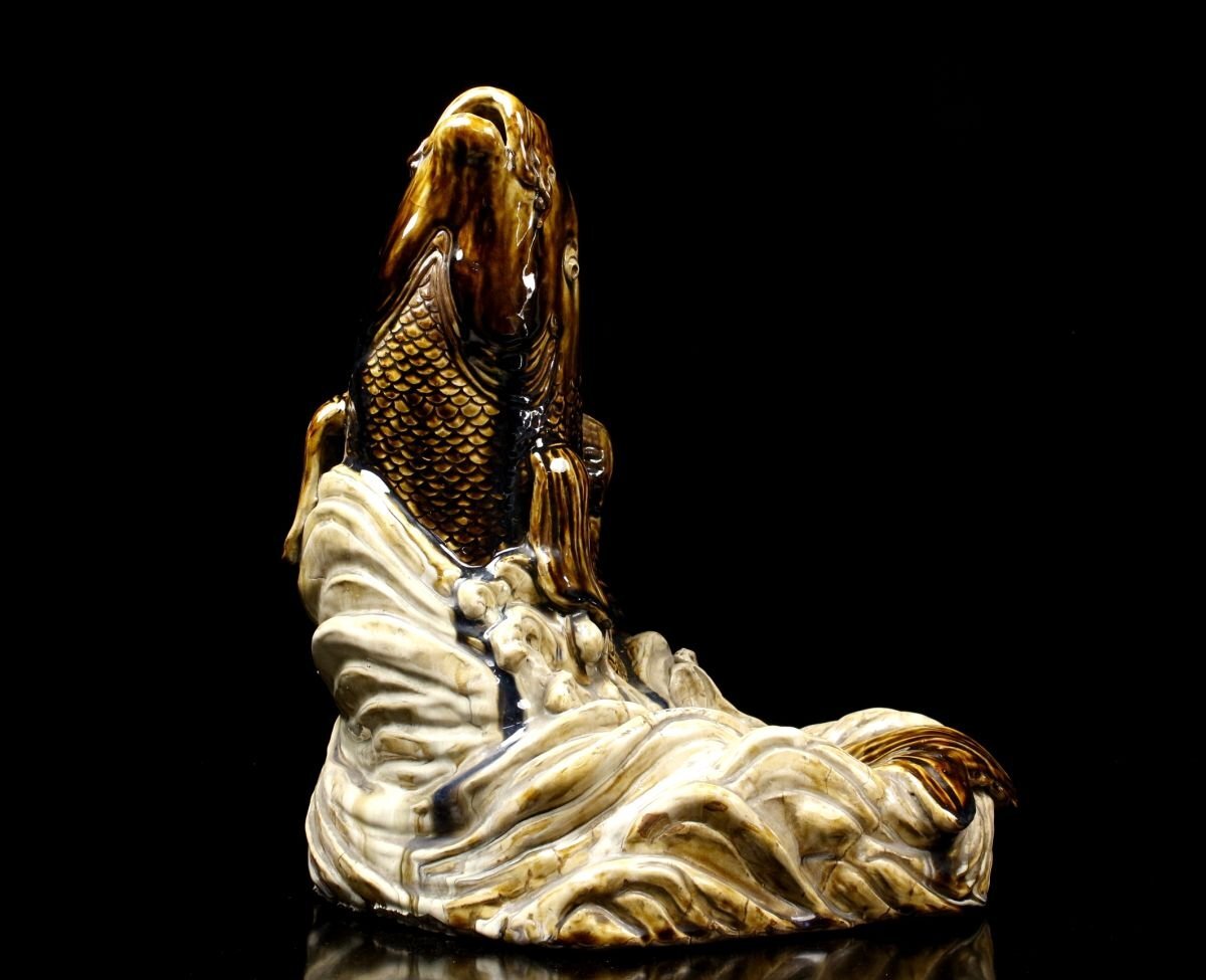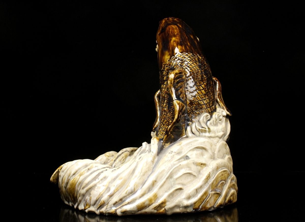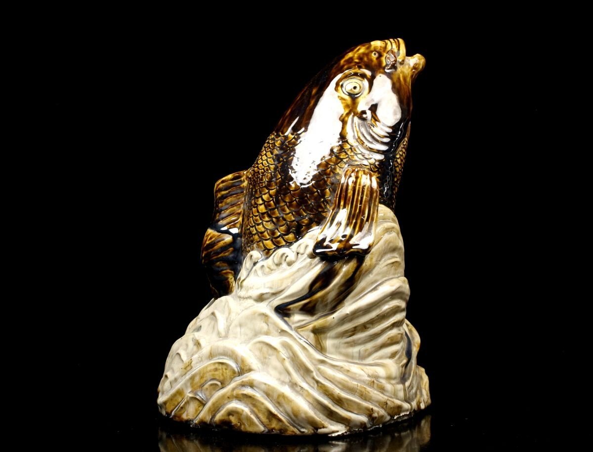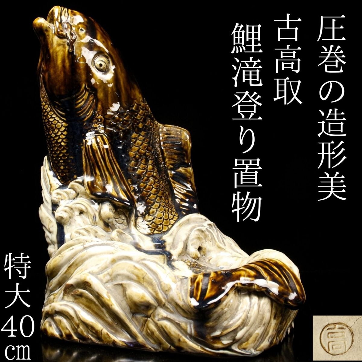 * * * 商品詳細 * * * ここでしか出逢うことのできない唯一の美をご紹介させて頂きます。 古高取の特大作 鯉滝登り置物 雄大な滝を駆け上る鯉の躍動を、緻密かつ力強い造形で表現した圧巻の一品です。 釉の落ち着いた深みと土味の素朴さが相まって、古陶ならではの重厚な存在感を放ちます。 力強さの中にしなやかな曲線美を宿し、見る者を引き込む格調高い趣。 茶席や床飾りに、圧倒的な存在感と雅趣を添える逸品です。 この機会に是非ご堪能下さい。 ■サイズ/横35㎝×高40㎝×奥行27㎝ ■状態/ スレ、傷、汚れ、窯被、底に割れがございます。 ※写真にてご確認、ご了承の上ご入札下さい。