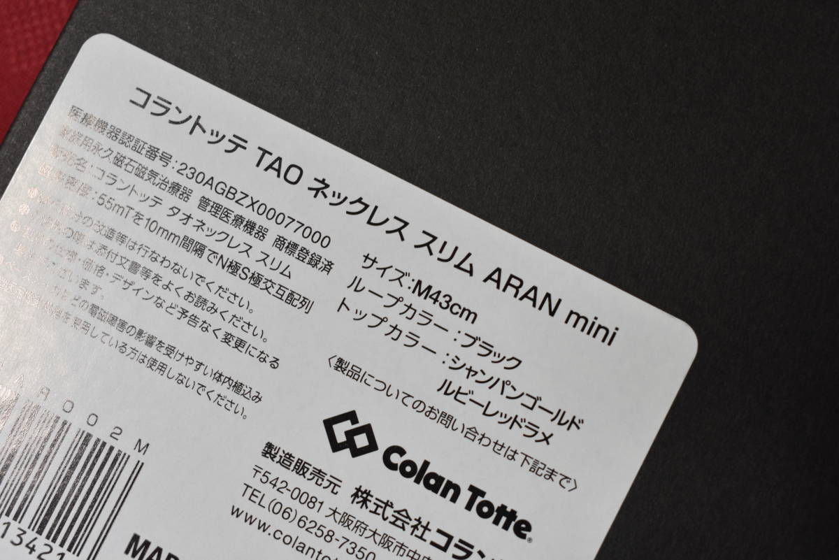 | おすすめポイント | 未使用品です。 保証書付属(取り扱い店捺印なし) メーカHPより 商品概要 細いループのスリムタイプに「ARAN mini」が登場。 菱形のアラン模様をモチーフに設計されたトップは、コラントッテの「C」と「O」が作り出す幾何学的なデザインが特徴。3mm径のスリムなループで軽い着け心地でありながら、4mm径のTAOネックレスと同等の磁力(55mT)を実現しています。 スペック 商品名:TAO ネックレス スリム ARAN mini(アラン ミニ) 品番:ABARO 医療機器認証番号:230AGBZX00077000 適応サイズ:M(43cm)、L(47cm)、LL(51cm) カラー:<ループ>ブラック<トップ・ジョイント>シャンパンゴールド×ルビーレッドラメ 材質:【本体】樹脂コーティング磁石【トップ・ジョイント】ステンレス(SUS316L/18金仕上)、エポキシ樹脂、POM 磁石:樹脂コーティング磁石 55mTを10mm間隔でN極S極交互配列 | ||||||||