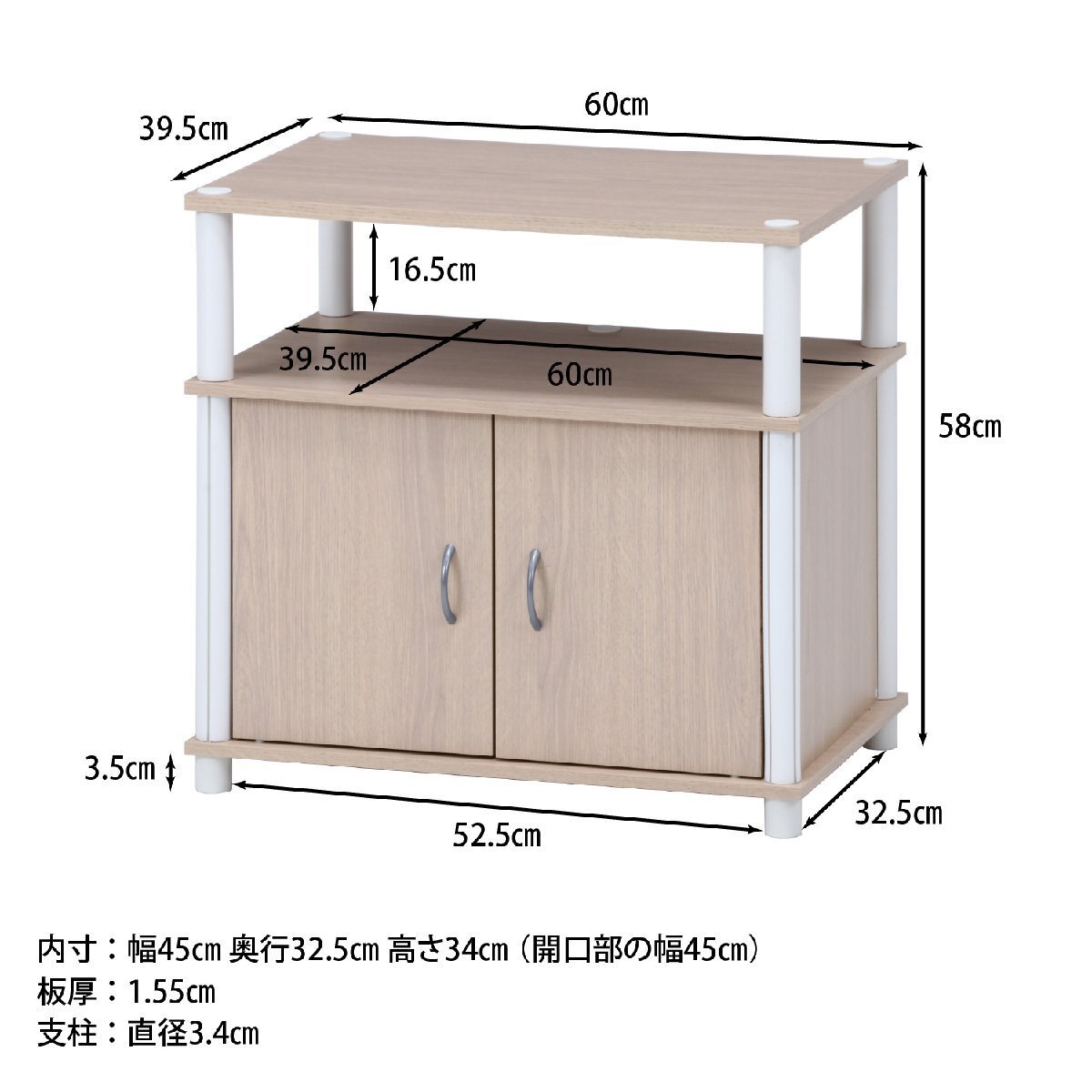 | サイズ | 幅600 × 奥行395 × 高さ580mm 耐荷重(天板):15kg 天板厚み:15mm 収納扉部内寸:450x325x340mm 適応TVサイズ:22V型まで ※詳細はサイズ画像をご確認ください。 |