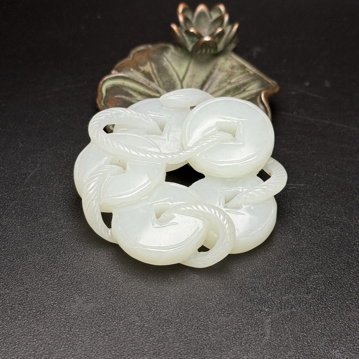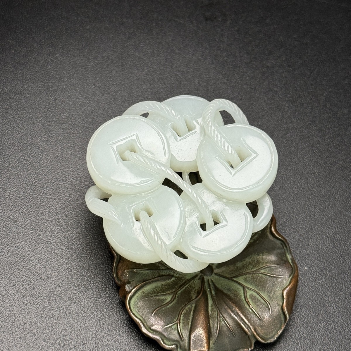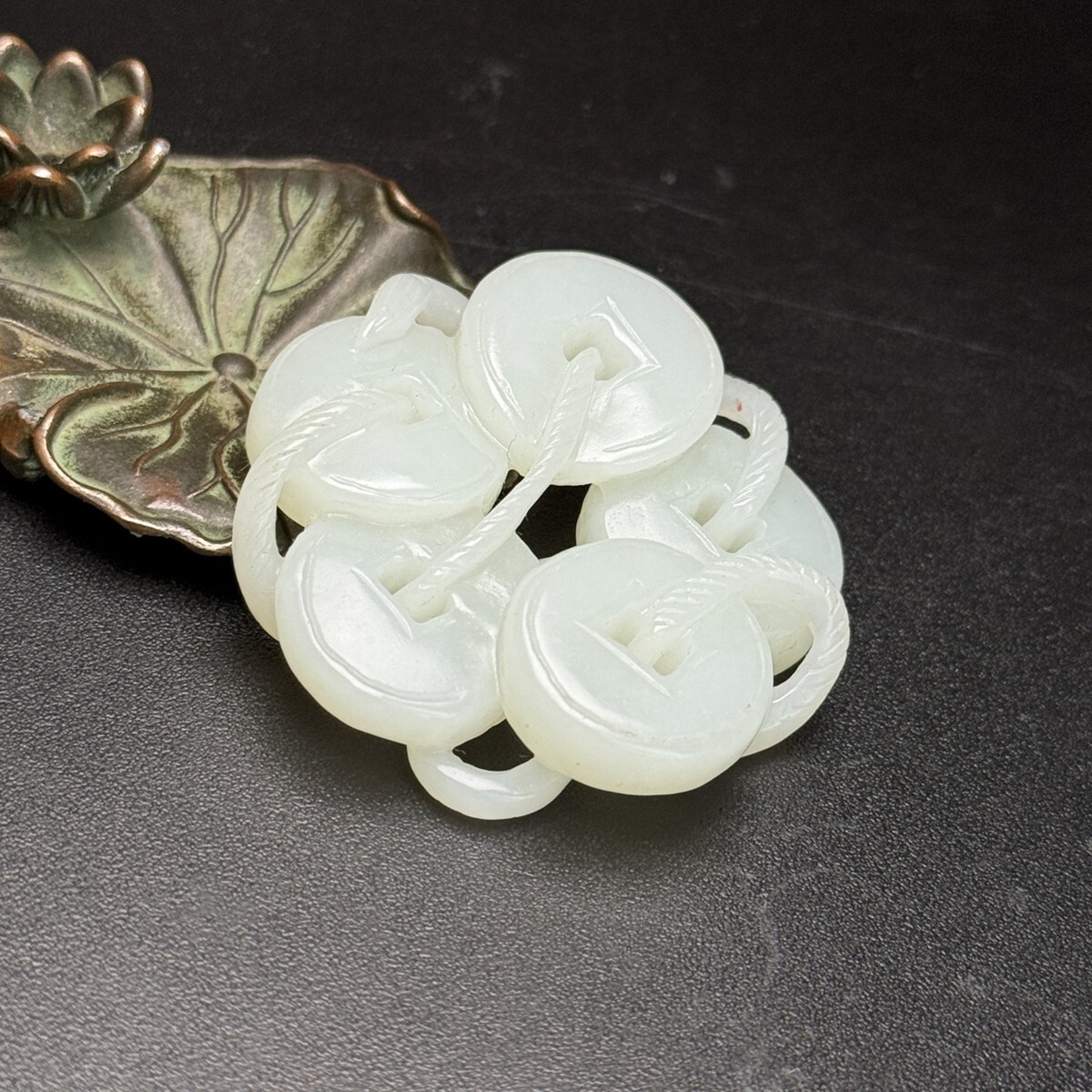 「時代物 和田玉 白玉彫り 銭生銭 招財進寶 銭串」極細工 裝身具 賞物 中国古美術 旧蔵出