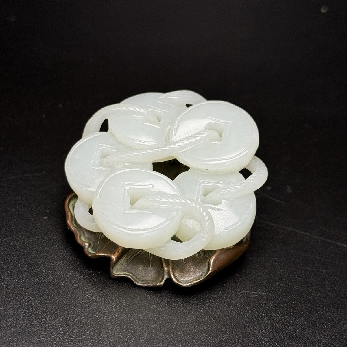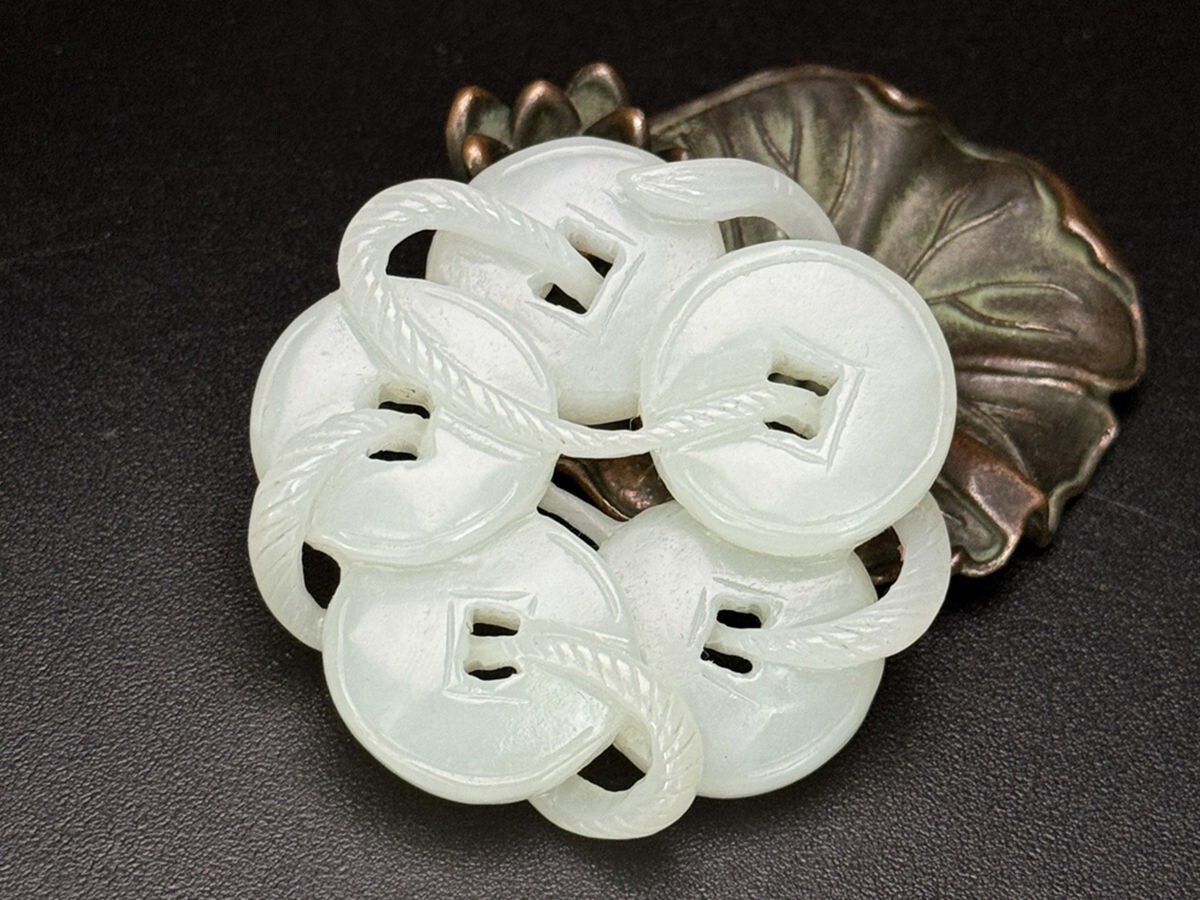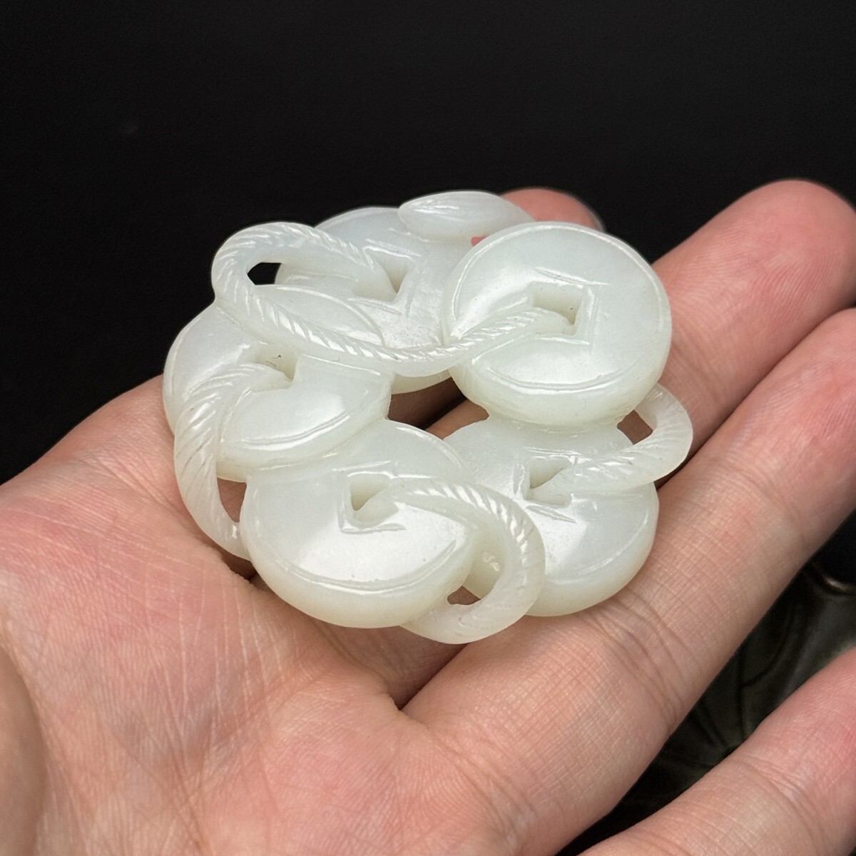 「時代物 和田玉 白玉彫り 銭生銭 招財進寶 銭串」極細工 裝身具 賞物 中国古美術 旧蔵出