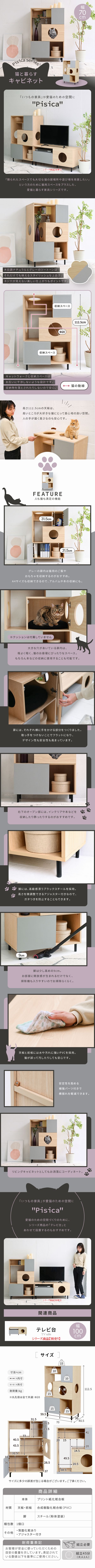 | 大切な猫と楽しく過ごせる猫家具シリーズ”Pisica”。 リビングで猫がゆったりとくつろいでいる様子が楽しめるリビング収納です。 覗き穴から愛猫の寝姿が見られ、キャビネット中央にはキャットウォームもあるので、猫にとっては飽きない家具です。 |