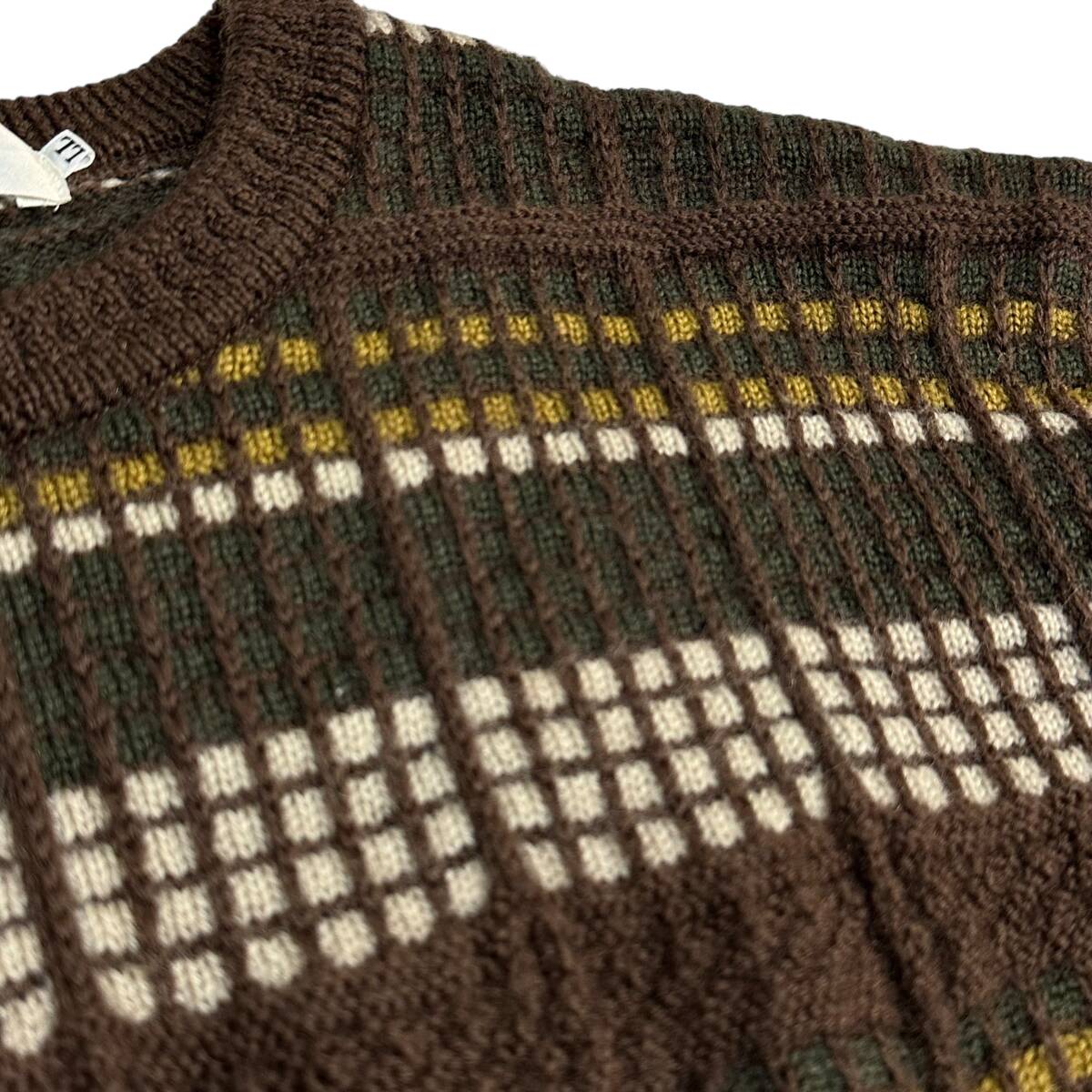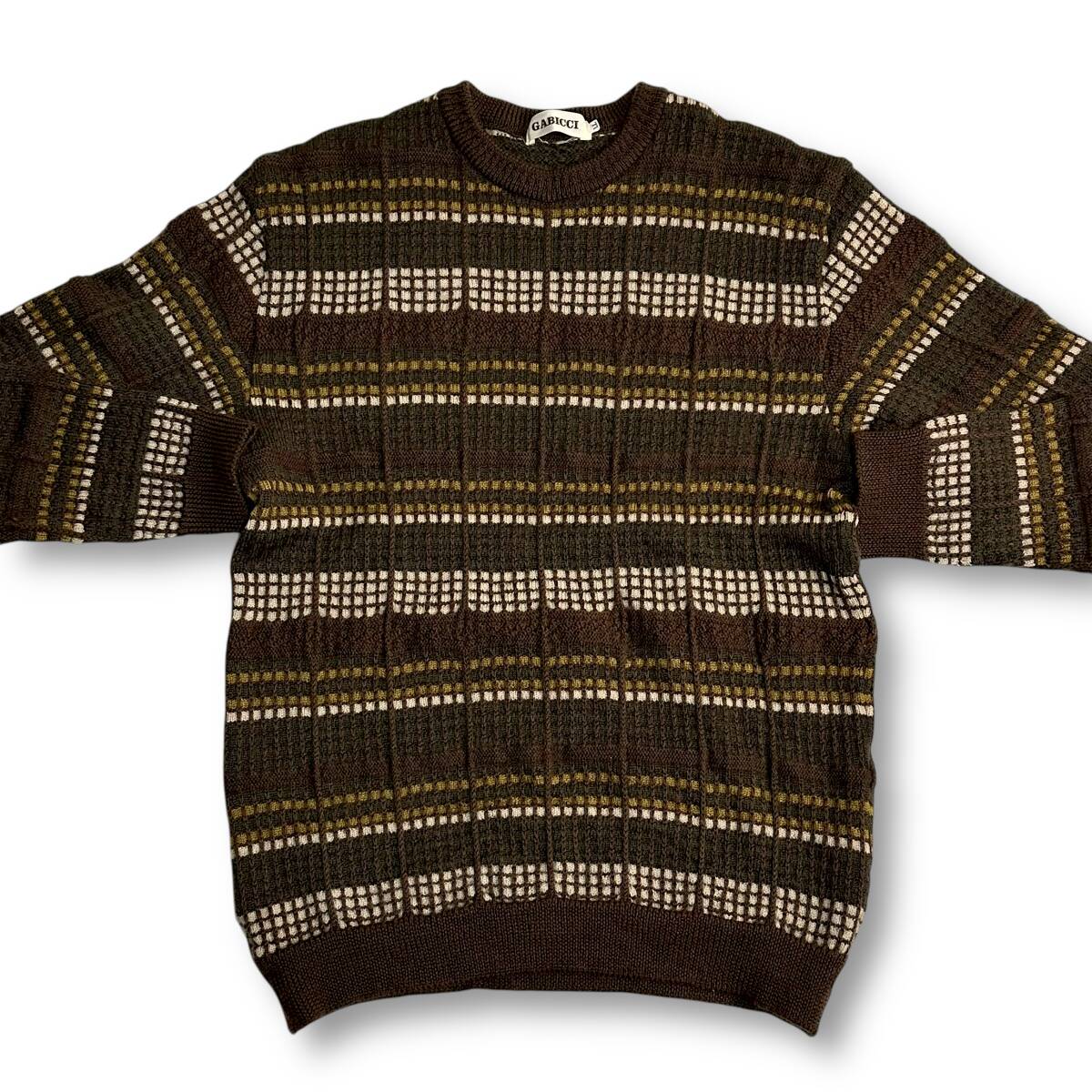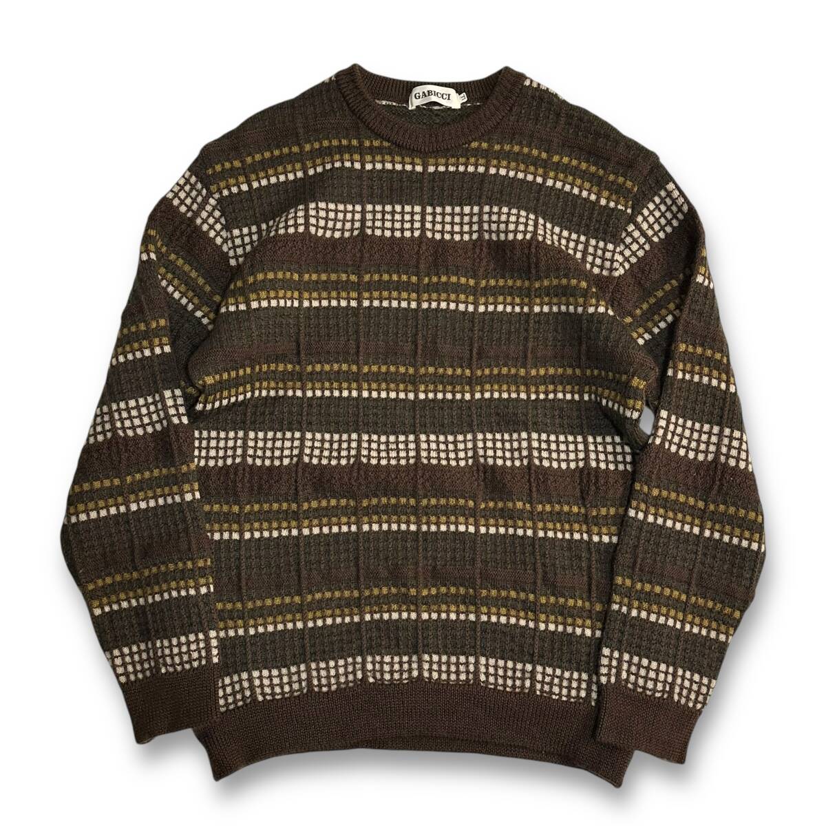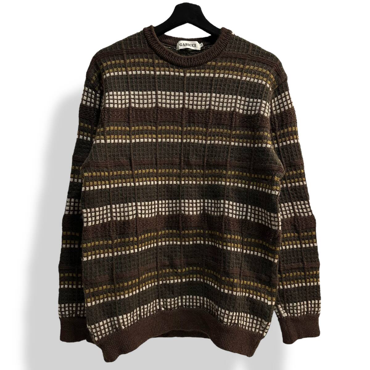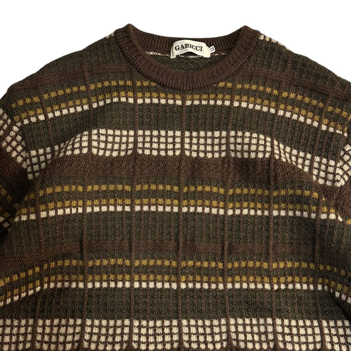 秀逸【GABICCI】00s パネルデザイン調 チェック ウール100% クルーネックニット カジュアル ブラウン 日本製 GIM