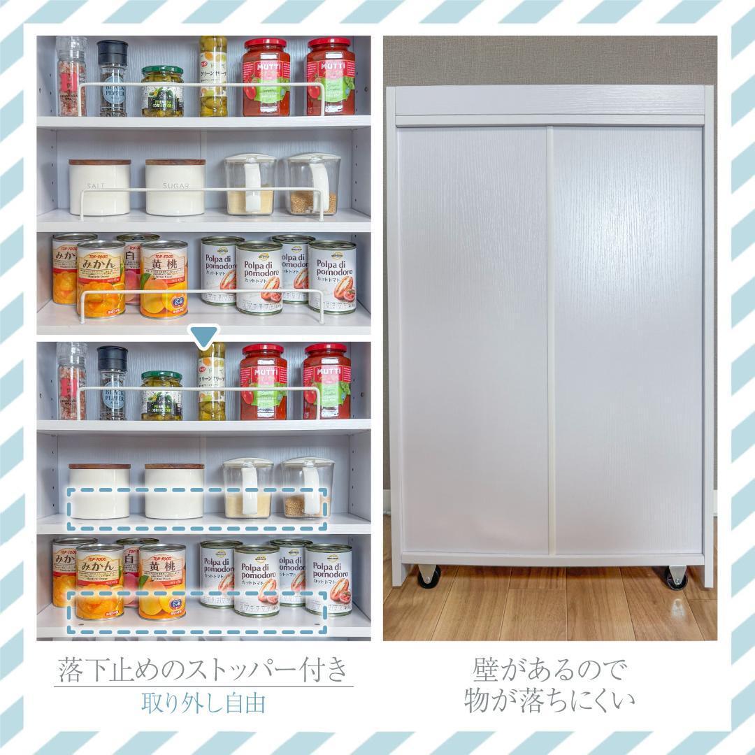 3cm間隔・15段階の高さ調整が可能な可動棚仕様で、ボトル類から小瓶まで対応します。
