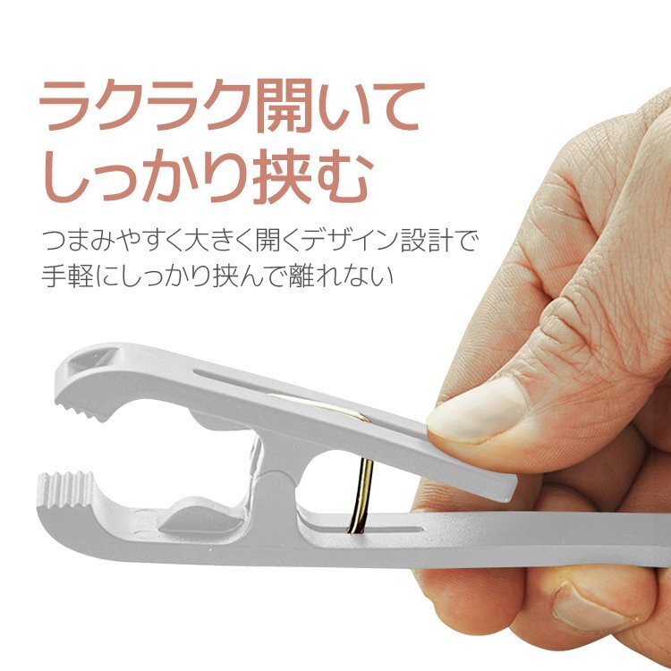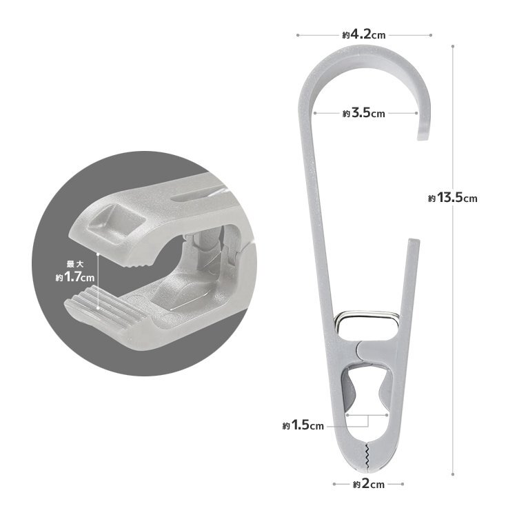 高耐久のABS素材で仕上げ、つまみやすく大きく開くデザイン設計で、しっかり挟んでホールドするので、カーテンフック、シャワーカーテンフックとしても活躍。