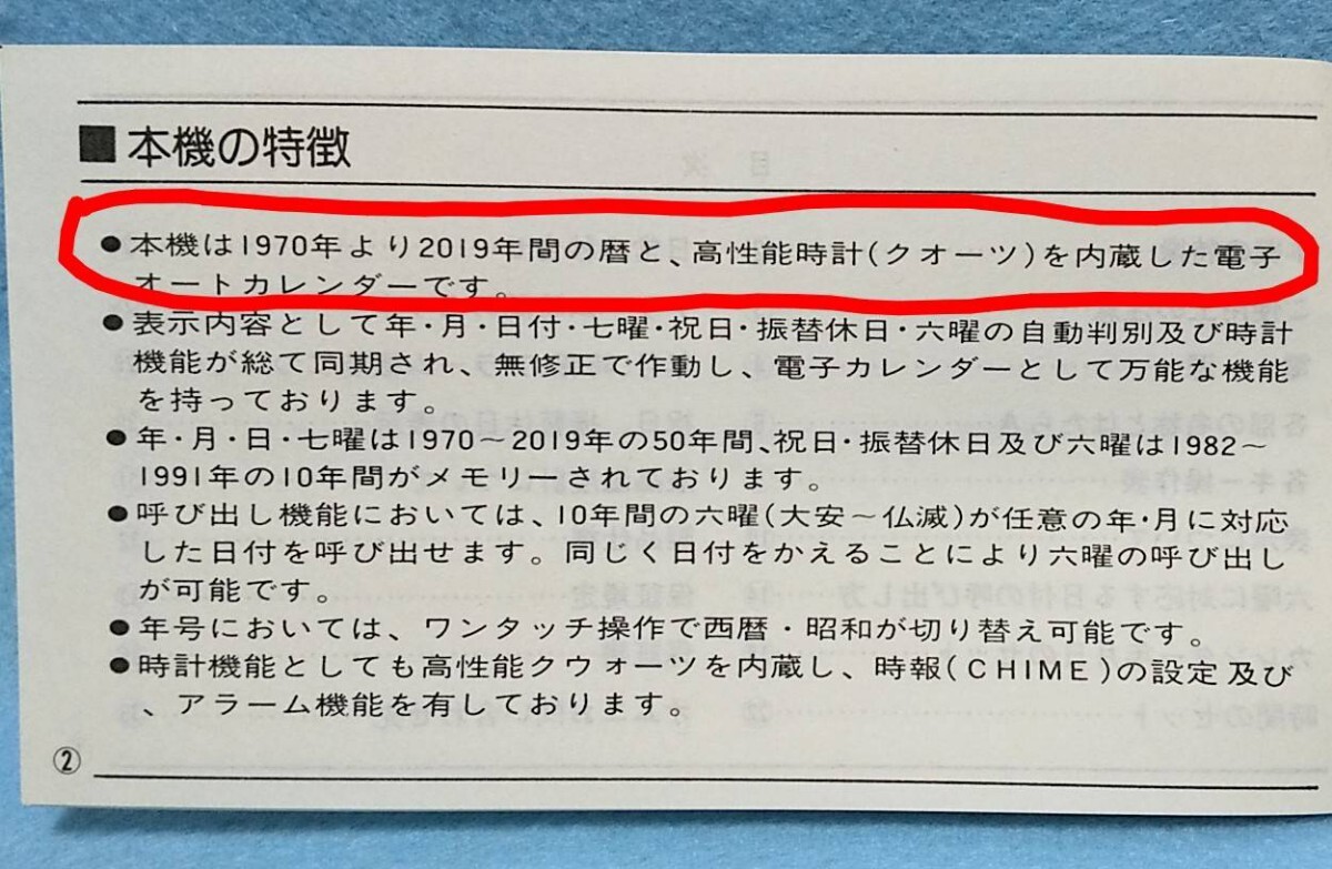 製品の仕様で西暦2019年までしか対応しておらず、カレンダーとしての実用には差し支えます。また、短時間の動作確認で状態を判断しているため長期間継続して使用できるかは判断ができておりません。