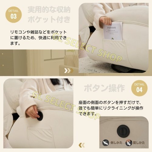 • 【簡単な操作】ボタン前方を押したら背もたれが自動に倒れ、ボタン後方を押したら背もたれが起こし、それぞれ10秒ぐらいかかります。また、右下の袋で、リモコンや雑誌など、日常用品を入れるので、ソファーの利便性を向上させます。