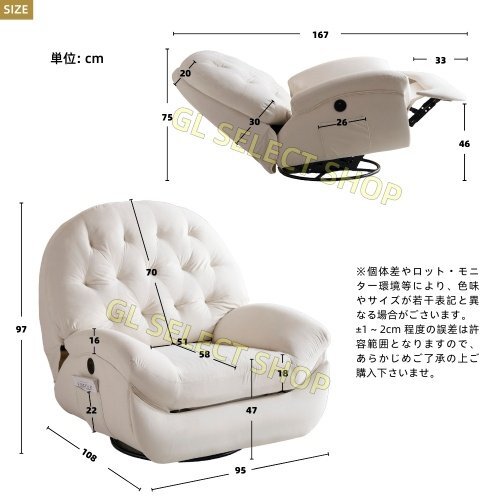 • 【調整可能なリクライニング機能】背もたれは105°-160°調整可能で、最適な角度にリクライニングできます。160°まで調整する場合は、腿部がゆっくり放置できます。身長150~175の方が横になるのは余裕です。そして、ソファーは前後揺れるだけでなく、270°回転もでき、リラックスしたいときや作業をしたいときに便利と楽をもたらします。