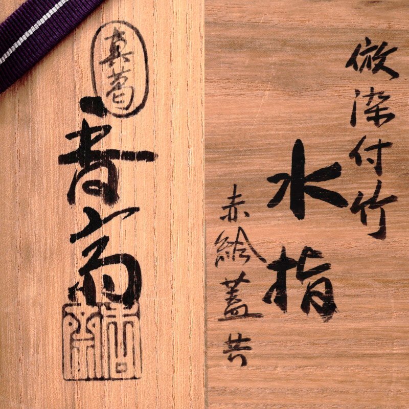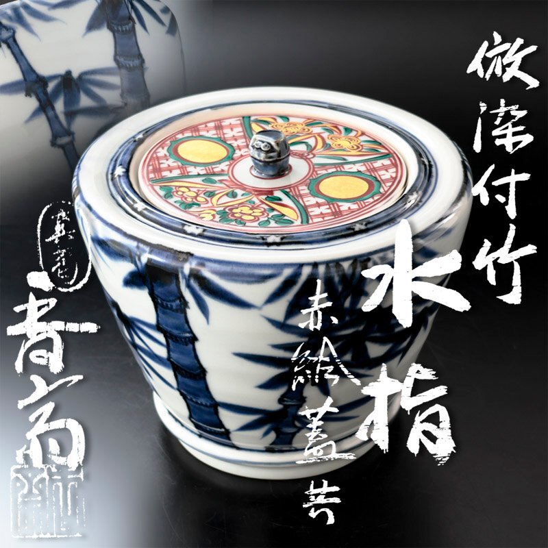 | 【古美味】真葛香斎 倣染付竹水指 赤絵蓋共 茶道具 保証品 |