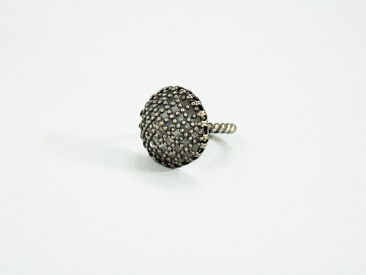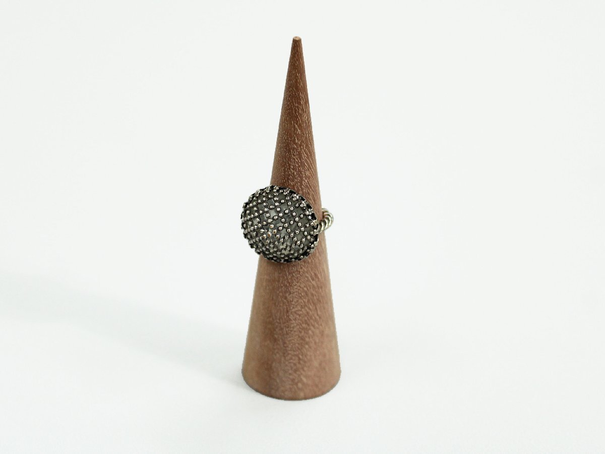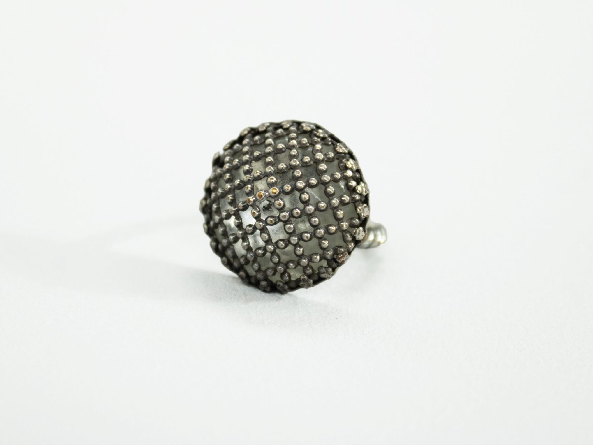 格子状にデザインされた半球のモチーフの内側にクリアのストーンが内蔵された、一見シンプルながら凝ったデザインが目をひきます。