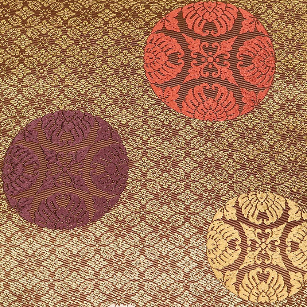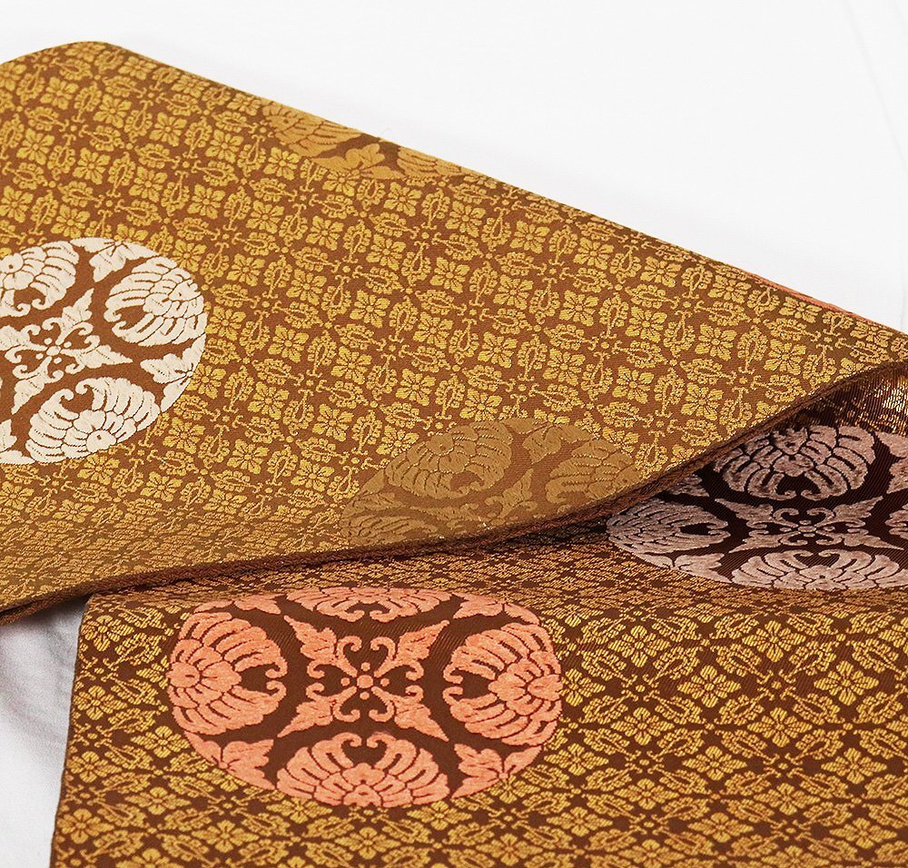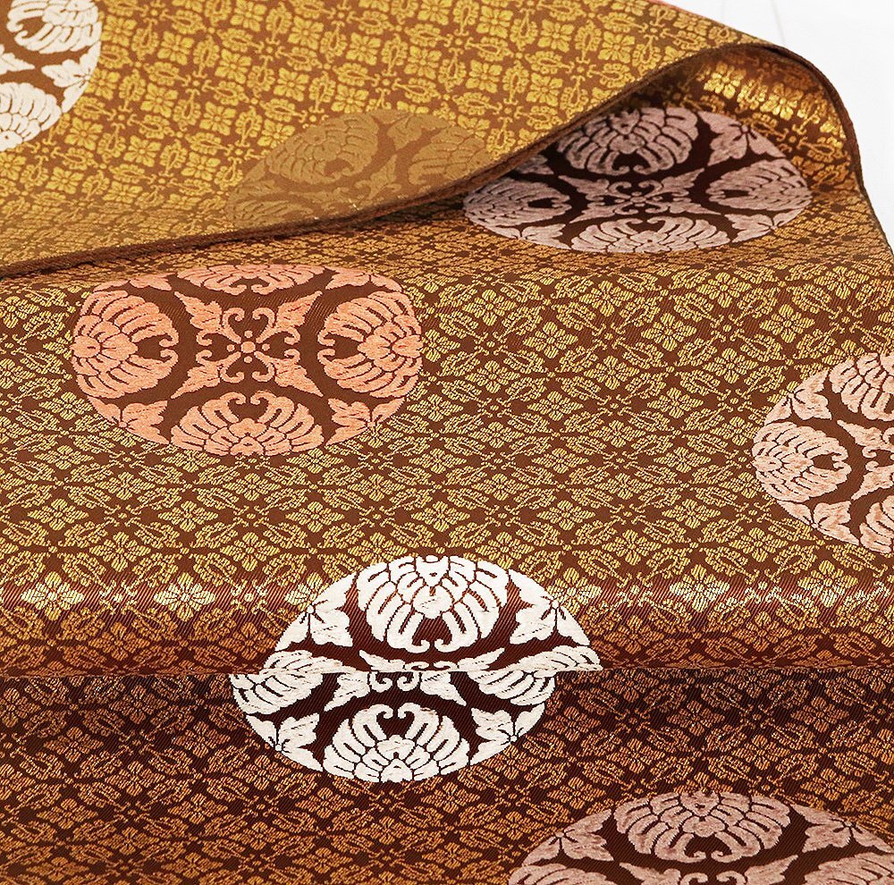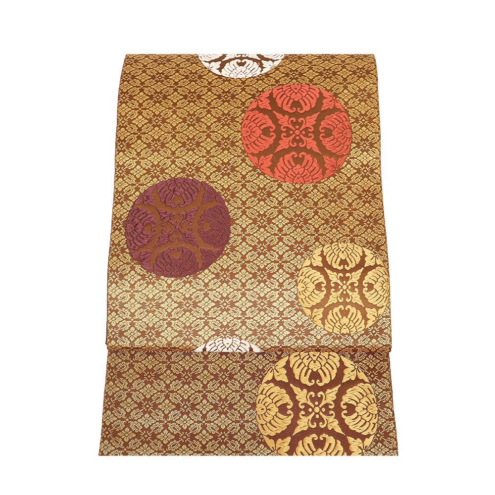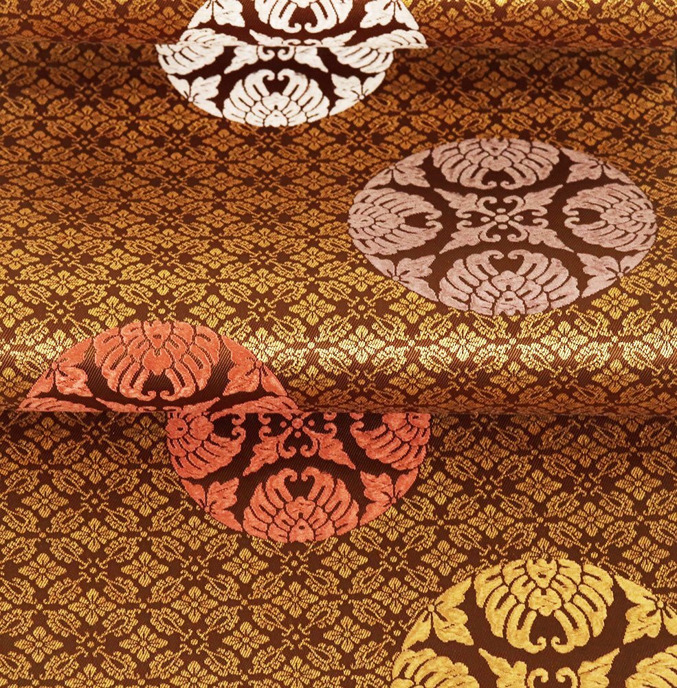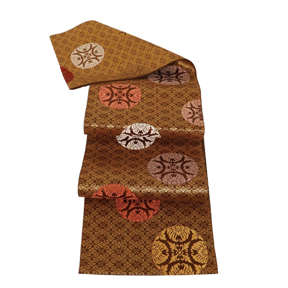| 商品 | 西陣織袋帯 赤茶・金・地 唐織・四つ割華文・花菱七宝文 未使用品 仕立て上がり |