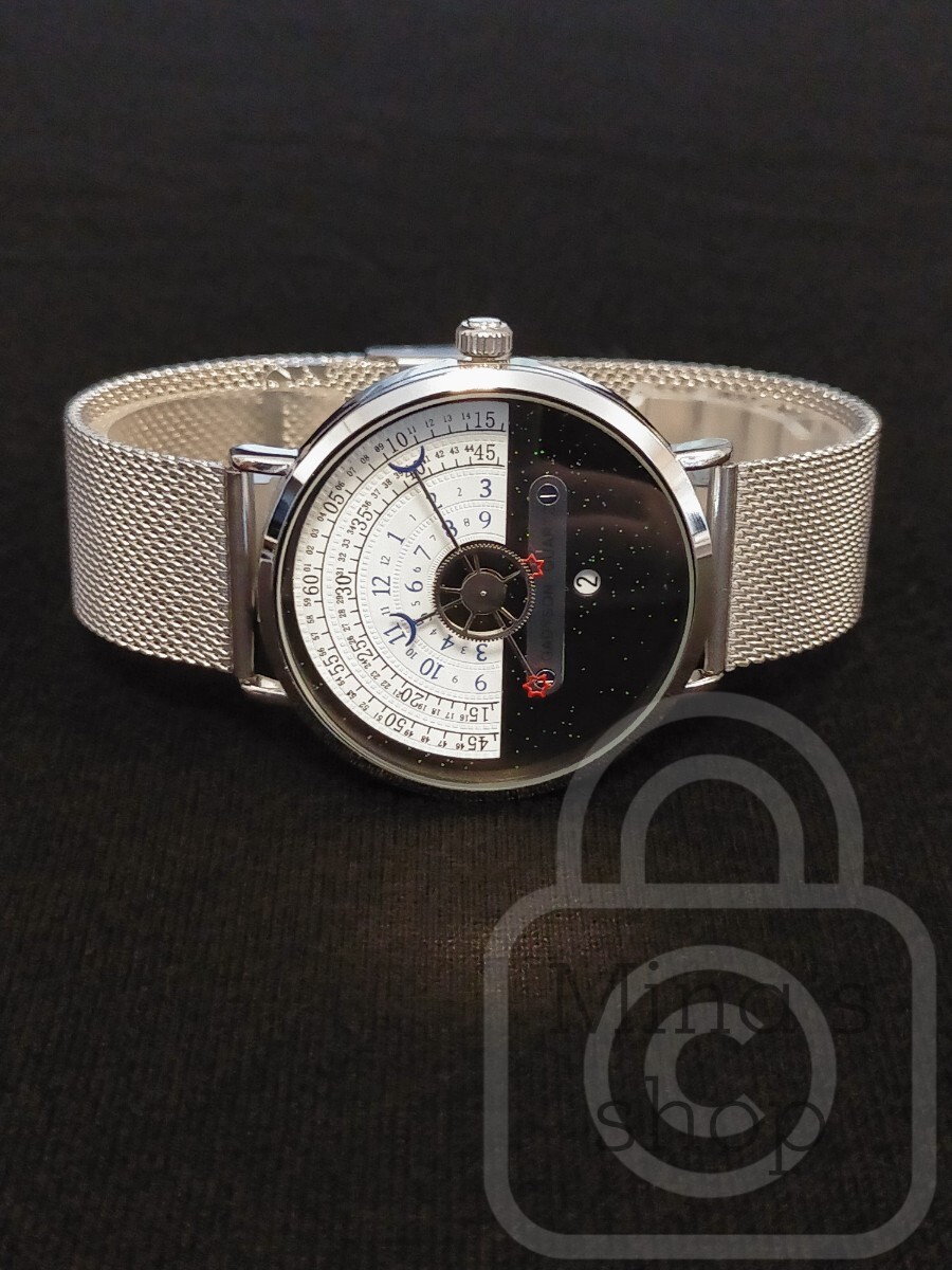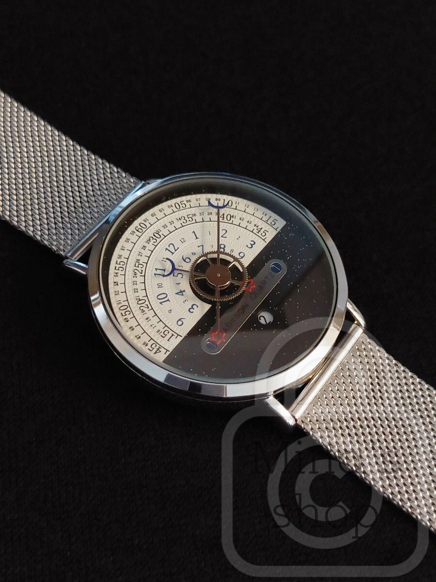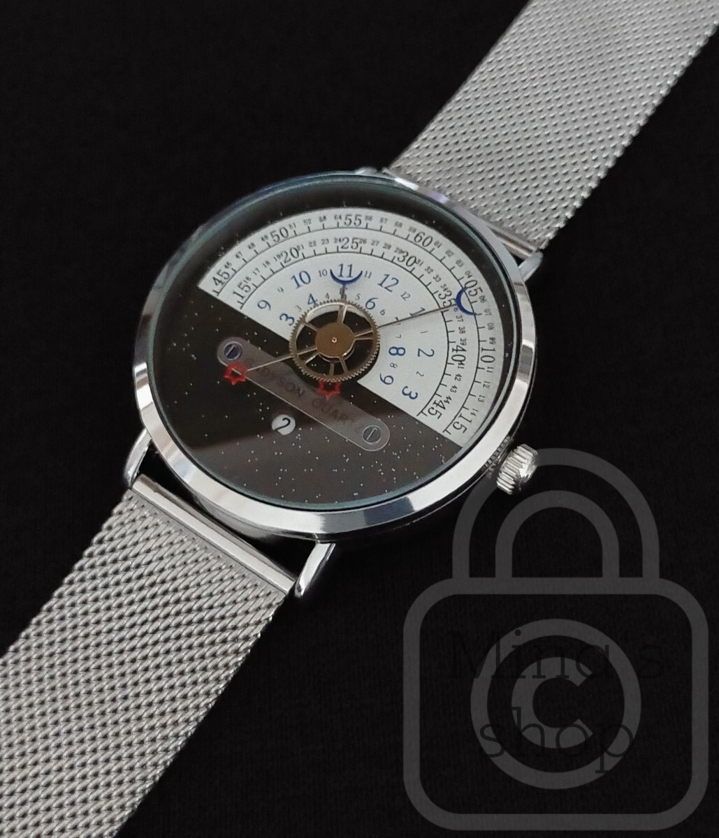 文字盤の上半分の半円の外側2本のライン上に分表示がされており、中心に接続している長針により指し示されます。