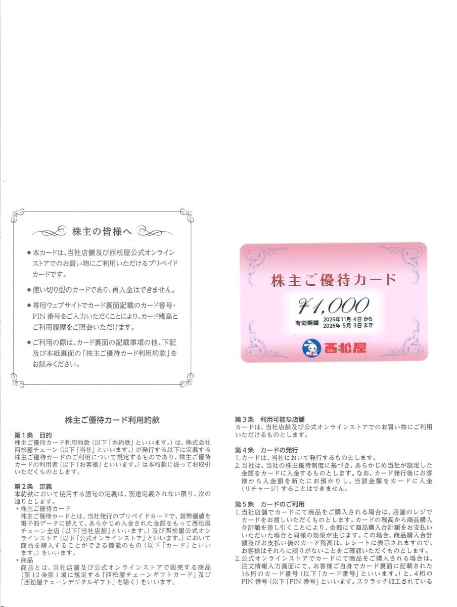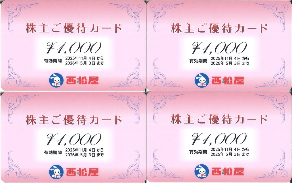 | 商品説明 | 皆様はじめまして! このたびは当出品ページをご覧いただき誠にありがとうございます! 【商品内容】 最新の 西松屋チェーンの株主優待カード 4,000円分 (1,000円カード × 4枚) の出品です。 ★ゆうパケットポストmini(匿名配送、追跡あり)で送料無料で配送いたします。 ◎全国の西松屋チェーンの全店舗にてご使用できます。 ◎有効期限: 令和8年5月3日まで です。 ◎優待券の詳細に関しては↓↓↓にてご確認ください。 https://www.24028.jp/ir/stock_holder |