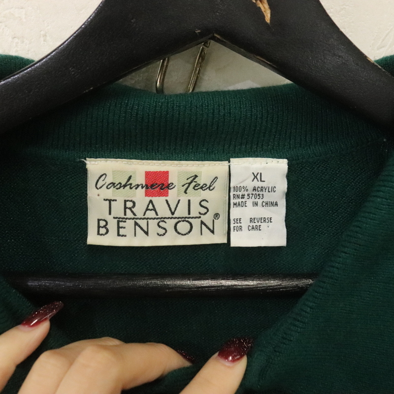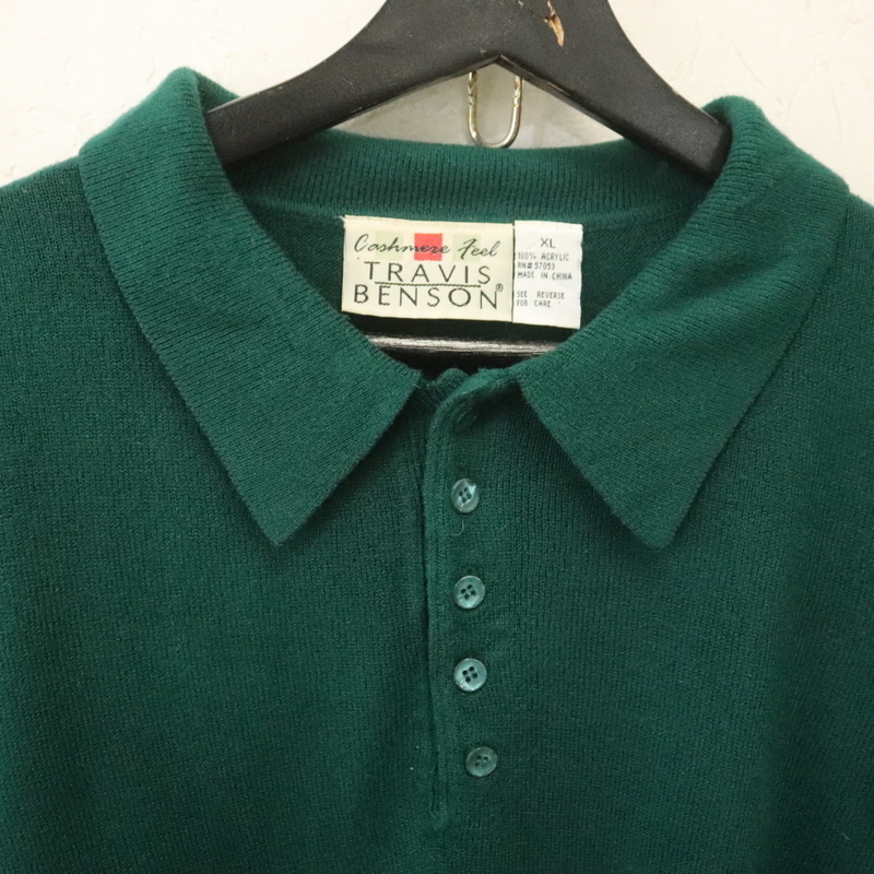 r511 90sビンテージ TRAVISBENSON 長袖ニットポロシャツ■1990年代製 表記XLサイズ グリーン 無地 アクリルニット アメカジ 古着