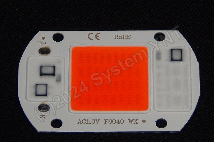 最新のCOBタイプで写真のもの。植物が必要とする赤外線~赤色、青色~紫外線に発光エネルギーを集中させたLEDで、電源は110Vで20W(日本のAC100Vでは約17W)。小型電球型の同様なLED(5W)にくらべ約4倍、非常に明るいので直接ランプを見てはいけません。発光色は植物に不要な緑色部分が省かれているためピンク、又は紫色。なので一般照明には向きません。主な仕様は以下のとおり;