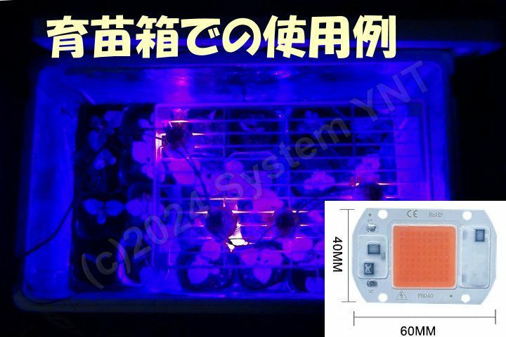 電球の効率(約10%)に比べてCOB型のLEDは約5倍、加えて照射角が電球の1/3(360/120=3)なので、5x3=15倍、20Wなら電球300W(蛍光灯なら約150W)に相当します。植物の光変換効率は約1%しかないので、これくらい強力な光を当てないと効果は出ません。逆に言うなら20Wの50%は熱になってしまいますから、放熱板は最低でもアルミ板、厚:1mm超、20x20cm以上が必要。放熱が不十分で高温で使用すると寿命が短くなります。発送は定形・簡易包装、当方のID及び取引に関する詳細は以下のURLを参照;
