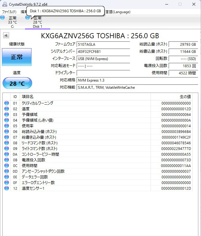 ・CrystalDiskInfoにて確認済みで正常です(写真の通り)