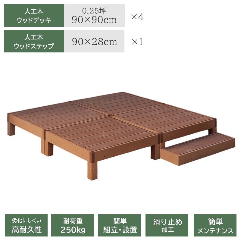 ウッドデッキ ウッドステップ 5点セット 人工木 樹脂製 90×90cm×28cm 90×28cm×10.5cm ライトブラウン 小上がり 高耐久性