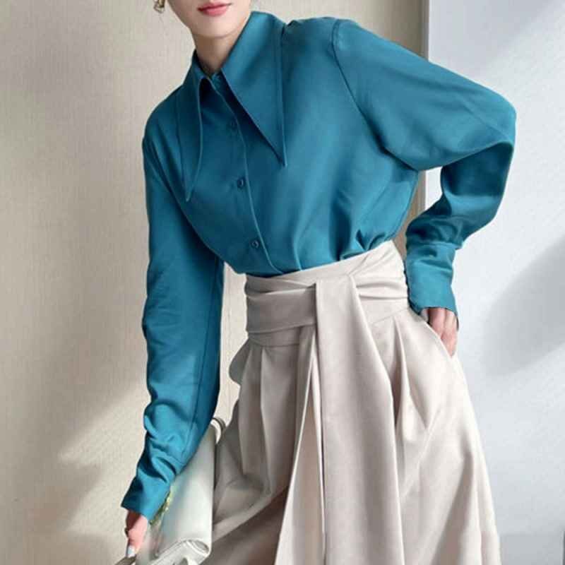 ボリュームたっぷりの襟が特徴のビッグカラーブラウス。