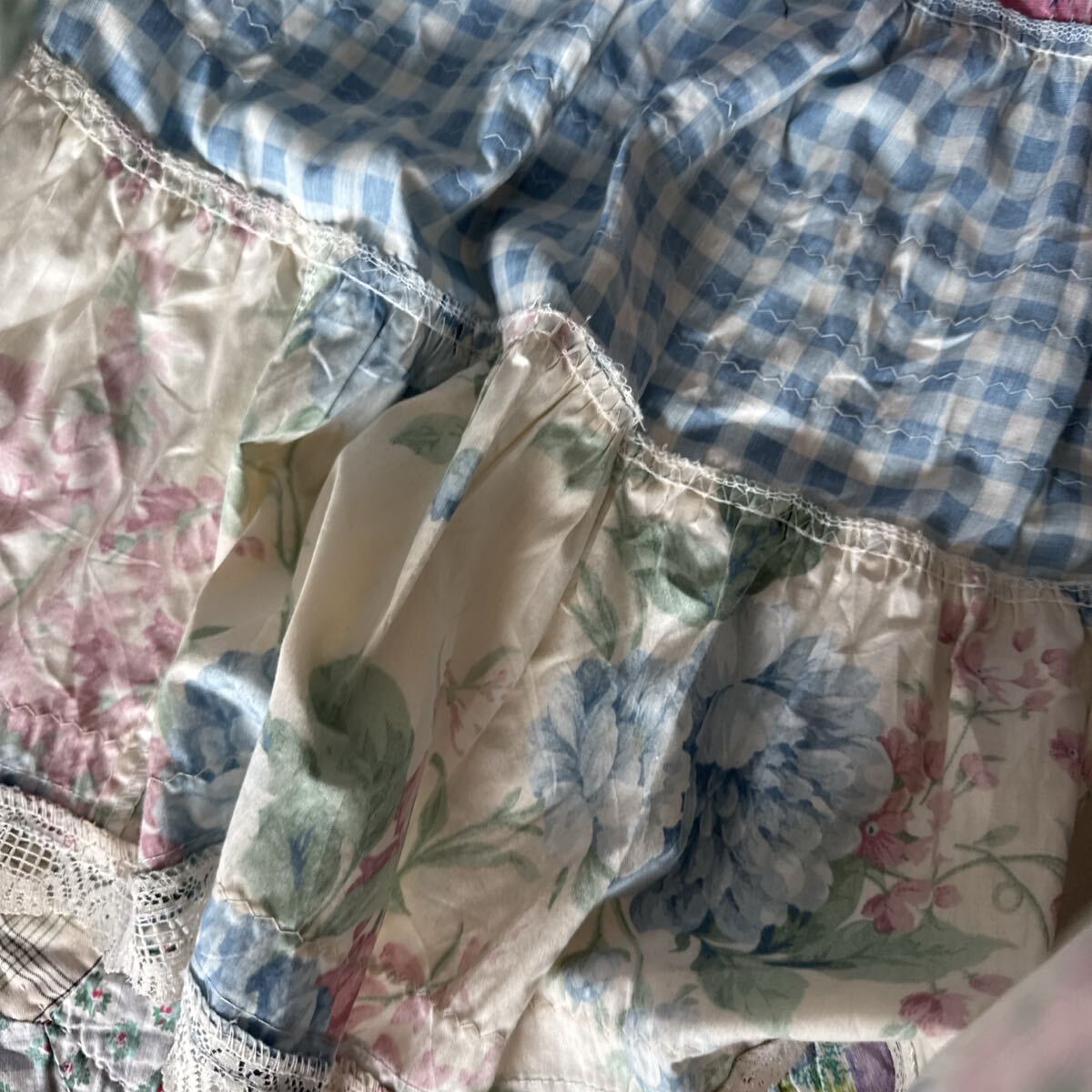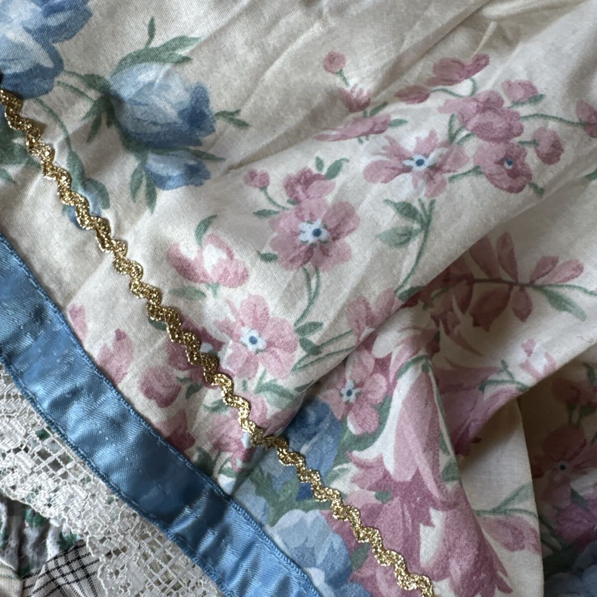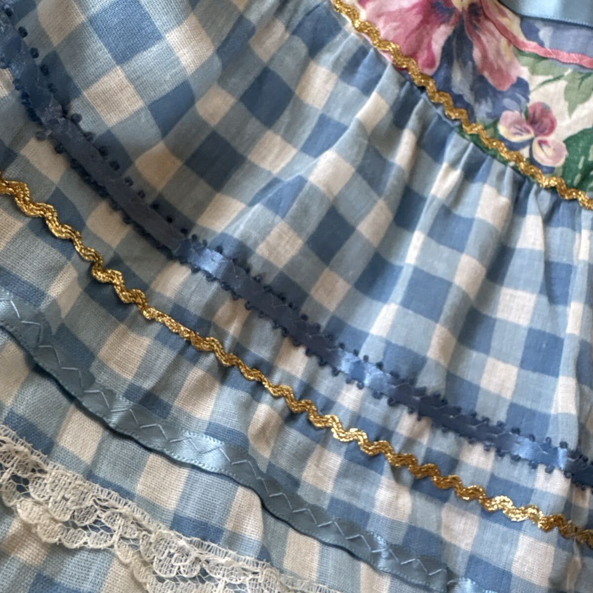 小花柄・ギンガムチェック・フローラルプリントなど、異なるパターンを贅沢に組み合わせた存在感抜群の一枚です。ふんわりと広がるシルエットとウエストゴム仕様で、着心地も◎カントリーガール、ボヘミアン、フォークロアスタイルにもぴったりです