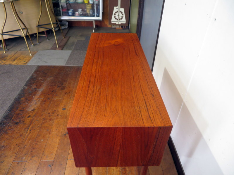 同様なカスタムのチェストや引き戸シェルフ等は割と多く出回っていますので珍しいことはありませんが、本品は細く長いチーク削り出しの無垢脚が取り付けられていますので、サイドボードやコンソールテーブルのような佇まいです。