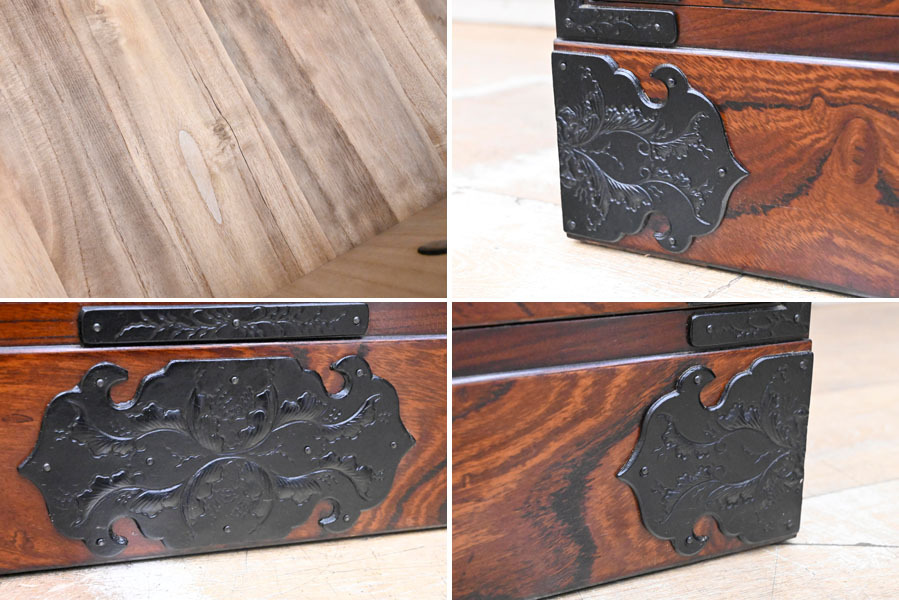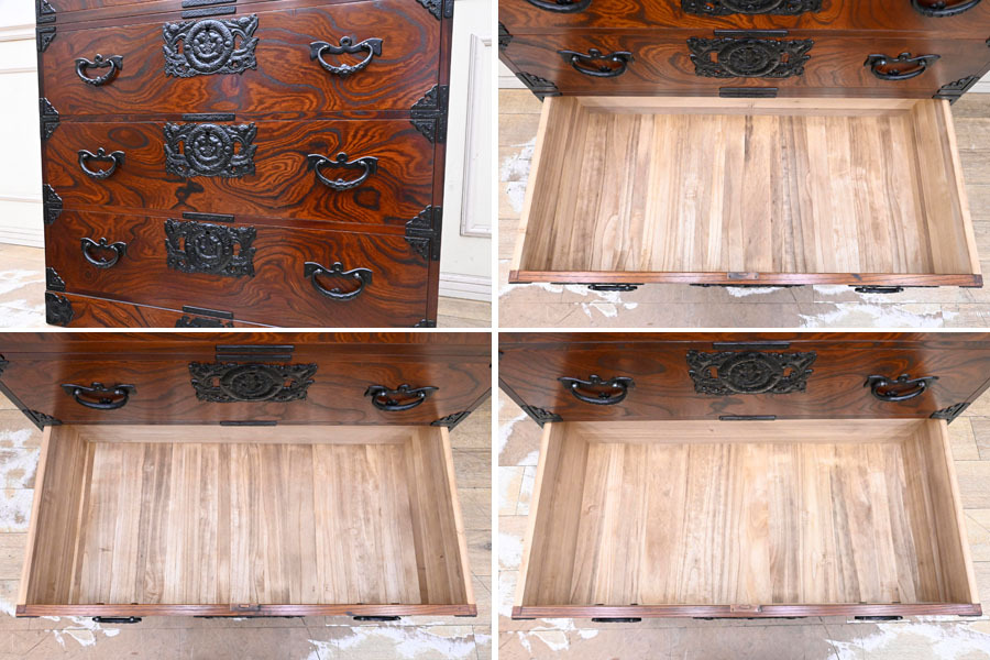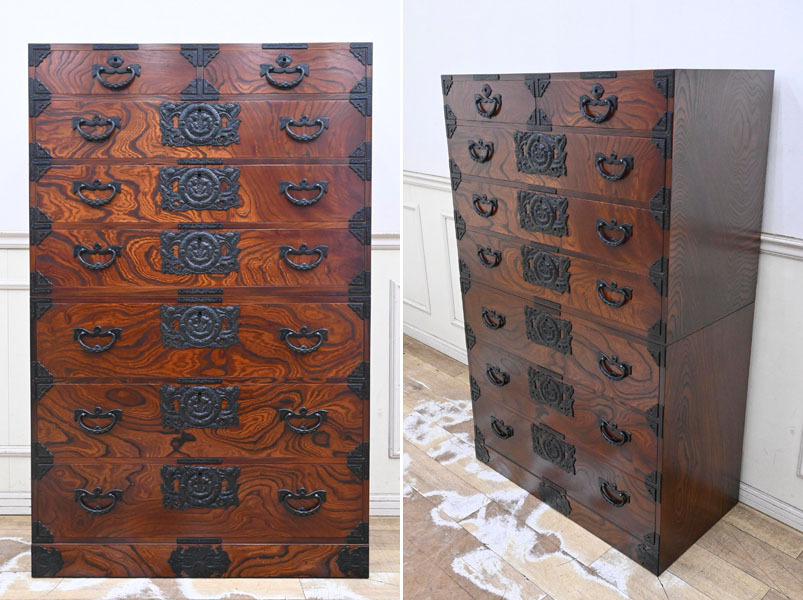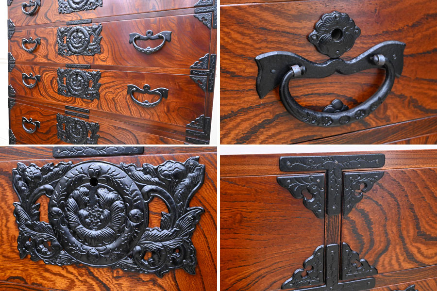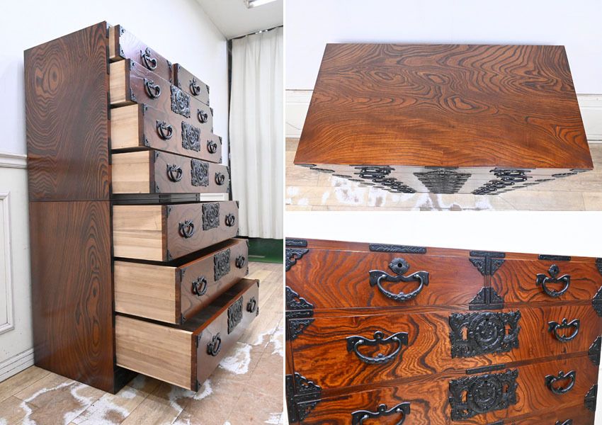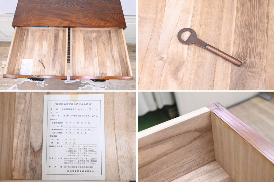 ----------------------------------------------------------------------------------------- ●送料や注意事項は必ずご確認下さい。落札後にトラブルになるケースが増えております。● ◆コンディションは写真・文章にて記載して有りますが、全てのキズの写真は掲載致しておりません。大きなダメージを除き見落とし、記載漏れが有る事はご了承下さい。 ◆当サイトにて出品する商品は多種多彩で、当方商品知識の無い物も多数ありますので落札後の質問やメンテナンス等にはお答えできません。 ◆入札された時点で、画像、文章をご理解していただいたものと判断させていただきます。不明な点は前もってQ&Aからお願い致します。入札後の質問やお電話等でのキャンセルは一切受け付け致しません。 ◆商品説明に「ノークレーム」と記載しているものに関しては、如何なる状況で届いても保証致しません。詳しくは注意事項の「商品到着後について」の最後に記載しておりますのでご確認下さい。 ---------------------------------------------------------------------------------------- 日本家具のトップメーカー、岩谷堂のハイチェストUSED品の出品です。 一級品の欅材を使用しているため、全体を覆う木目の流れは自然のみが表現できる最高級の芸術です。 それを補う南部鉄器の見事な重厚感が、日本を代表する家具に押し上げています。 作りに関しても竹釘を使うなど手抜きの無さは並の家具との違いを鮮明にしています。 一つの引出を入れると別の引出が出てくる作り込みは一級品です。 幅90 奥45.5 高141 下段高75cm 【コンディション】 中古品ですので若干のキズ、ガリキズ、薄汚れ、金具多少のサビ、引出内部防虫剤のニオイ、一番下の引出底板に少しヒビ、向かって左側面上部薄っすらとシミ?等有りますが、中古品としては状態良好です。 | ||