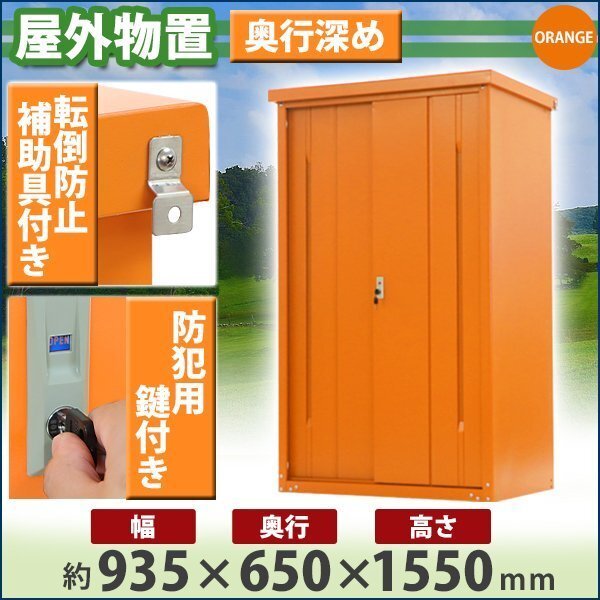 | 商品名 | 送料無料 屋外物置 スチール製 家庭用収納庫 鍵付き オレンジ 幅約935mm×奥行約650mm×高さ約1550mm UVカット 倉庫 納屋 物置き スチール物置 スチール収納庫 ガレージ 収納 可動棚 吊り戸 吊戸 吊り扉 上吊り 吊引き戸 庭 ガーデン monookishw9d60h15or |