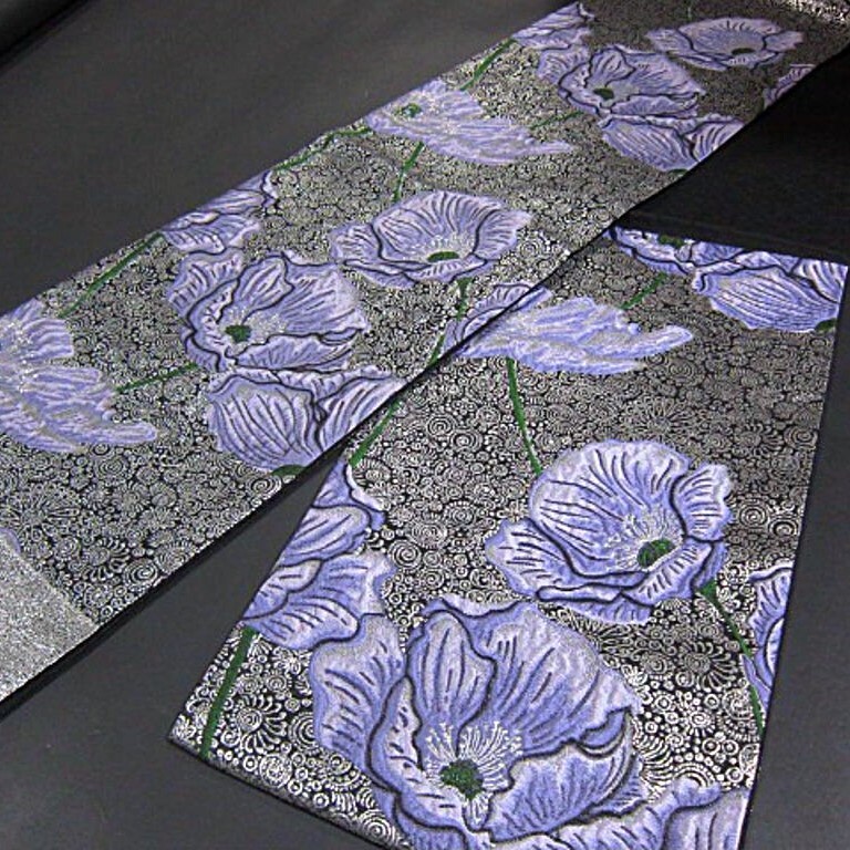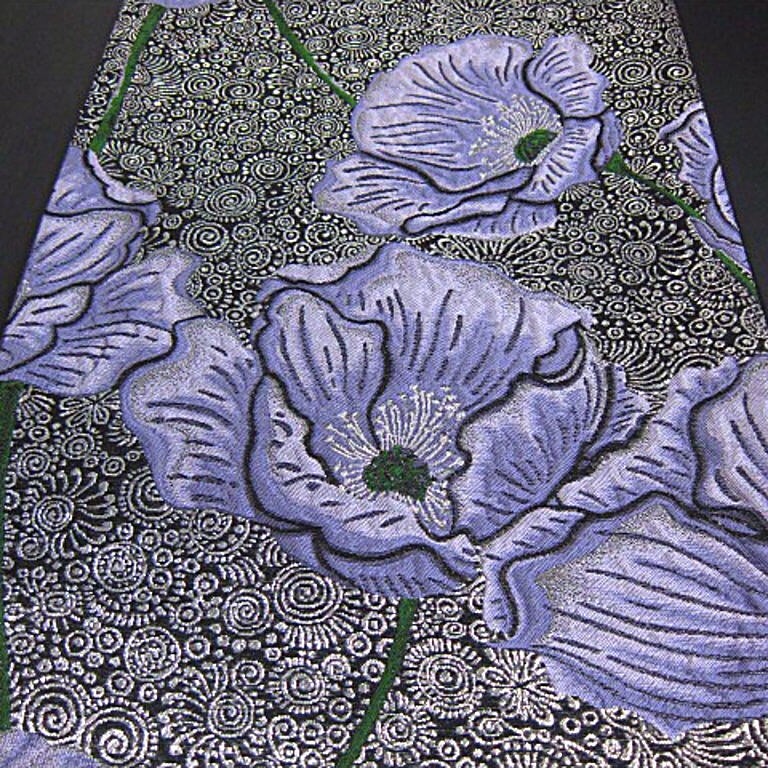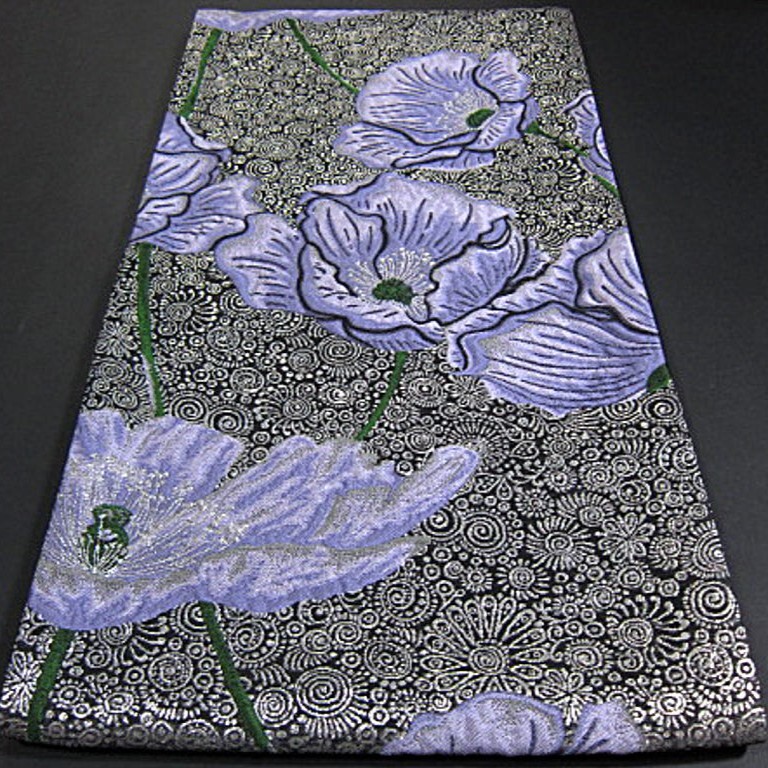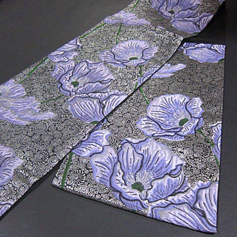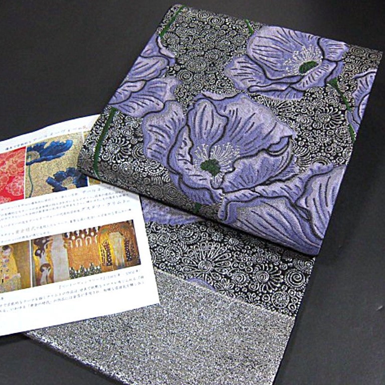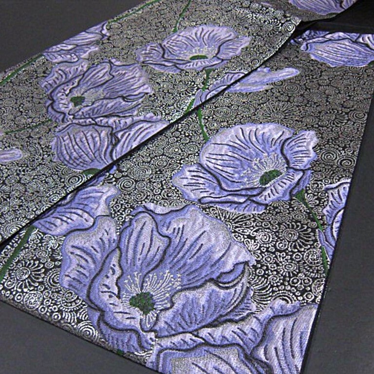 新品未仕立 西陣織袋帯です  『19世紀末、ヨーロッパを中心に爆発的に開花した新しい芸術アールヌーヴォー 華や植物などの有機的なモチーフや自由曲線の組み合わせによるデザイン。従来の様式に囚われない装飾性と鉄やガラスといった当時の新素材の利用が自然美をさらに輝かせた。その優美な曲線で描かれた愛らしいポピーの花、官能的な美術スタイル黄金様式で表現したレリーフ。重厚な色合いと官能的なやわらかい曲線、かつてのヨーロッパの熱気が感じられる』大人女性の装いに相応しい一品。お出かけ・お食事会・観劇などにいかがでしょうか。織り上がったばかりの帯になります。