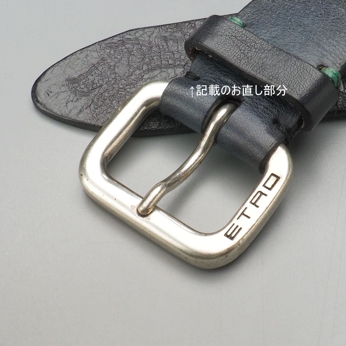 【コンディション詳細】 レザーの地色はネイビーと見られますが、経年や使用に伴い全体的にブラックがかった色味となっております。 ほかシワや歪み、薄い擦れキズ、バックル付け根のステッチのひとつが直されており、また裏面のシミや汚れなど見られますが、その他支障になるようなダメージ等はなくこれからも十分にご愛用いただけるコンディションです。 |