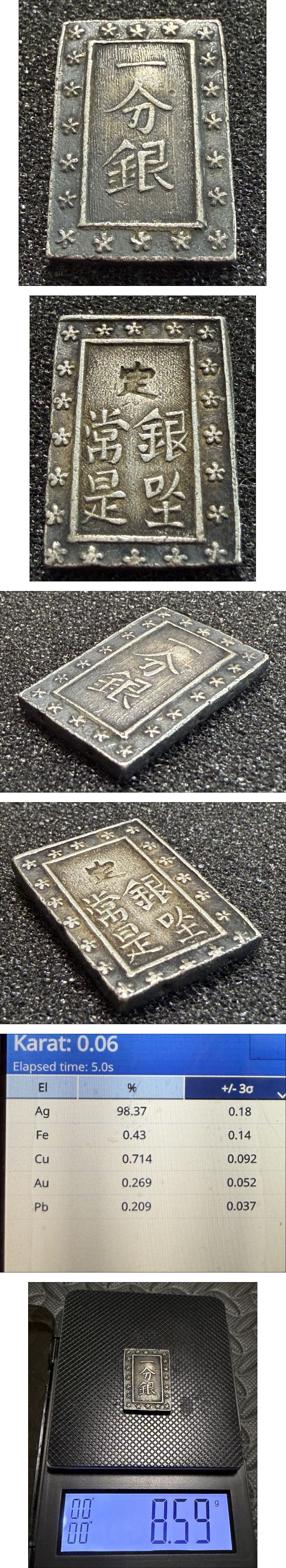 | 商品説明 | 【商品内容】 希少【本座 天保一分銀 Po 表面額縁様 】 【品位】 銀98.37% 金0.269% OLYMPUS VANTA 蛍光X線分析計機 (約400万円)で測定。 鑑定結果は写真に掲載しています。 【量目】:8.59g 【状態】: 銀座オークションにて落札した一分銀です。 【本座 天保一分銀 Po 表面額縁様 】となります。 コンディションは写真でご判断ください。 現状で気に入っていただける方のみお願い致します。 計量器は安価な物ですので多少の誤差はあると思います。 発送は【おてがる配送ゆうパケットポスト】を選んでいただき コインホルダーに入れ、プチプチに包み さらにプチプチ付き封筒に入れて発送いたします。 ◆あくまで個人保管品です。 画像にてご判断いただき、ご納得いただける方のみご入札をお願い致します。 また画像には限りがございますので、色味が異なる場合などあるかもしれません。 詳細部分にこだわる方、完璧をお求めになる方、状態に神経質な方もご遠慮願います。 商品状態に関しては個人差がございます。 落札後の商品状態による返品や故障時の補償は一切お断りいたします。 (すり替え防止の為) ◆不要なトラブルを避けるため、3日以内のご決済、 速やかな受け取り連絡をお守り頂ける方のみとしております。 あらかじめご了承ください。 お守り頂けなかった場合、落札者都合キャンセルとさせていただきます。 以上、全てをご了解いただける方のみご入札をお願い致します。 ■新規の方及び、評価が低い方の入札は取り消させていただく場合がございます。 ■領収証の発行は対応しておりません。 |